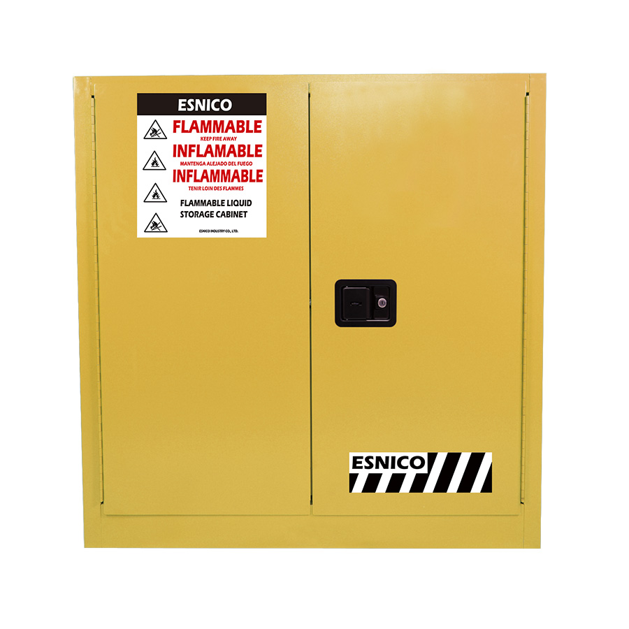 Provides fire resistance with a 38mm air gap between the double walls Built-in leak-proof sump prevents hazardous liquid spills from spreading Highly visible reflective warning labels quick hazard identification Ideal for laboratories, industrial facilities, warehouses, and workshops OSHA 29 CFR 1910.106 and NFPA 30 compliance Model No. - SSC030FY Material Specifications - 18-Gauge Steel Color - Yellow Standard - OSHA 29 CFR 1910.106, NFPA CODE 30, FM 6050 Capacity - 30Gal/114L Door Type - Manual close Number of Doors - 2 Adjustable Shelves - Yes Number of Shelves - 1 Shelf Loading - 100kg Accessories Included - 4 Adjustable leveling feets, 1 grouding kits, 2 keys and 1 user manual Dimension (LxWxH) - 109x46x112cm Net Weight - 89kg Gross Weight - 101.5kg