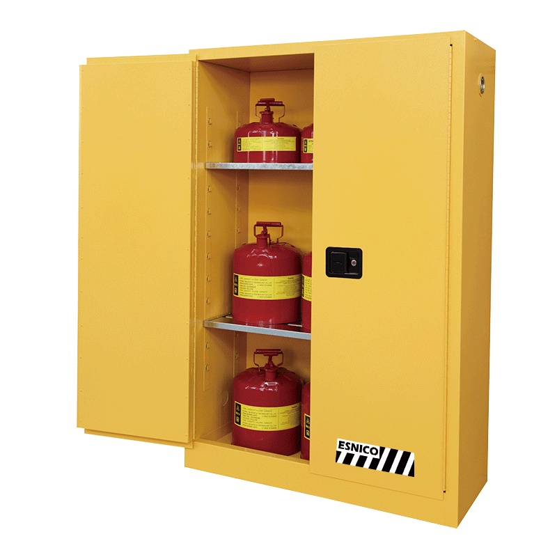 Provides fire resistance with a 38mm air gap between the double walls Built-in leak-proof sump prevents hazardous liquid spills from spreading Highly visible reflective warning labels quick hazard identification Ideal for laboratories, industrial facilities, warehouses, and workshops OSHA 29 CFR 1910.106 and NFPA 30 compliance Model No. - SSC045FY Material Specifications - 18-Gauge Steel Color - Yellow Standard - OSHA 29 CFR 1910.106, NFPA CODE 30, FM 6050 Capacity - 45Gal/170L Door Type - Manual close Number of Doors - 2 Adjustable Shelves - Yes Number of Shelves - 2 Shelf Loading - 100kg Accessories Included - 4 Adjustable leveling feets, 1 grouding kits, 2 keys and 1 user manual Dimension (LxWxH) - 109x46x165cm Net Weight - 125.5kg Gross Weight - 139kg