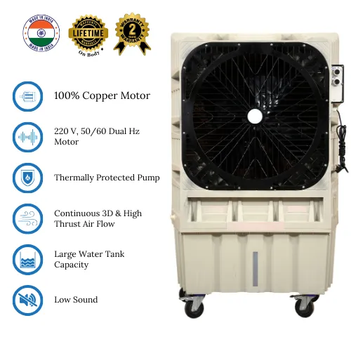 Description Industrial grade control knob Rigid body structure 5D Plastic grill Rear plastic guard Powerful air flow Easy installation and maintenance Louvers are designed to disperse in all directions High efficiency Honey Comb cooling pads Specification Water Tank Capacity - 120 L Air Flow - 18,000 CMH Fan Type - Axial Fan Fan Size - 30 Inch Motor Type - Single Phase 3 Speed Motor Winding - Copper Winding Speed - 950 RPM Power - 550 W Motor Power - 0.75 HP Unit Size (mm) - 1131*620*1642 MM Cooling Pad Size (mm) - 1100 x 100 x 1150 MM Area Coverage - 3000 Sq.ft. Gross Weight - 50 Kg