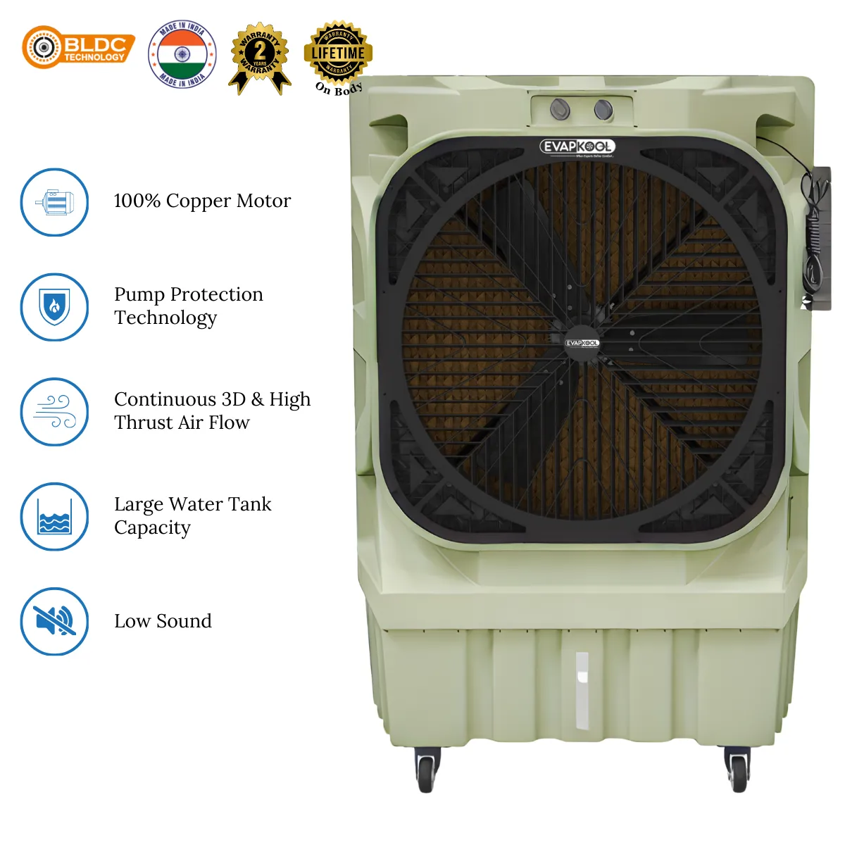 Description Industrial grade control knob Rigid body structure 5D Plastic grill Rear plastic guard Powerful air flow Easy installation and maintenance Louvers are designed to disperse in all directions High efficiency Honey Comb cooling pads Specification Water Tank Capacity - 120 L Air Flow - 18000 CMH Fan Type - Axial Fan Fan Size - 30 Inch Motor Type - Single Phase 3 Speed Motor Winding - Copper Winding Speed - 950 RPM Power - 420 W Motor Power - 0.55 HP Unit Size (mm) - 1131*620*1642 MM Cooling Pad Size (mm) - 1100 x 100 x1150 MM Area Coverage - 3000 Sq.ft. Gross Weight - 52.5 Kg
