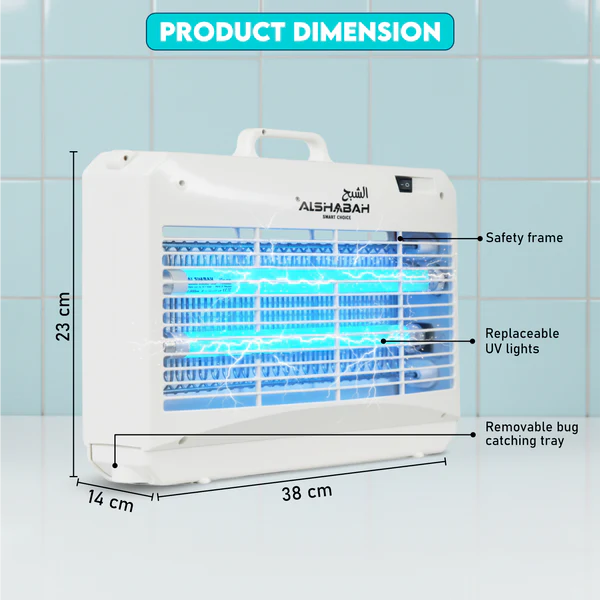 High-performance insect killer with a distinctive square design that can be ceiling-mounted or placed on a shelf. Proudly made in Jordan. Dual UV Lamps : Equipped with two UV lamps to attract insects effectively. Unique Design : Stylish design that can be ceiling-mounted or placed on a shelf. Powerful Shock : Delivers a 3600V electric shock to swiftly eliminate pests. Energy Efficient : Operates at just 20W for optimal performance. Proudly Made in Jordan.