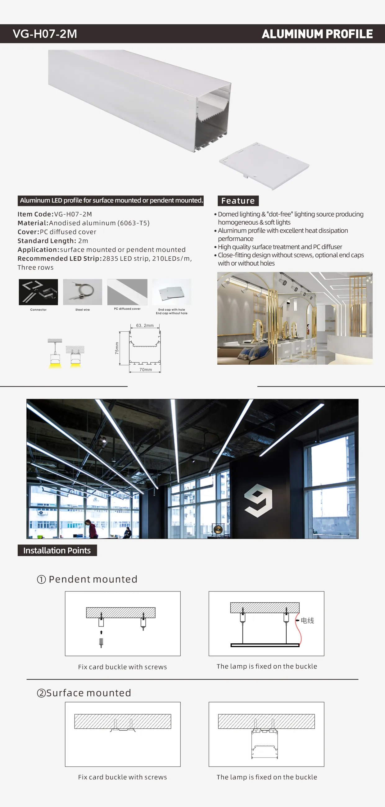 Material: Aluminum Cover: PC Inside bodysize: 63.2mm75mm2000mm Outside bodysize: 70mm Recommended strip: 2835 210led/m