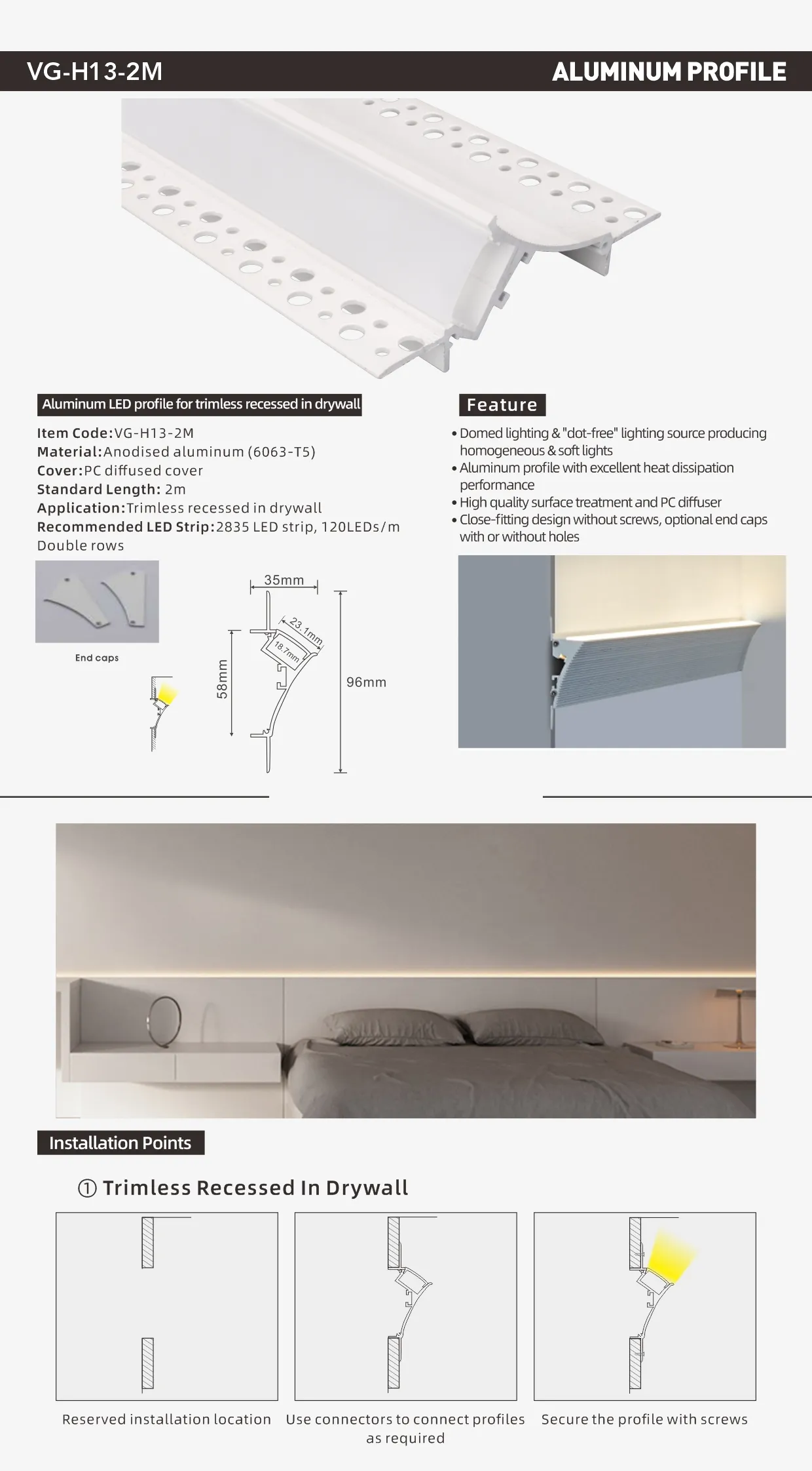 Material: Aluminum Cover: PC Inside bodysize: 23.118.72000mm Outside bodysize: 963558mm Recommended strip: 2835 120led/m