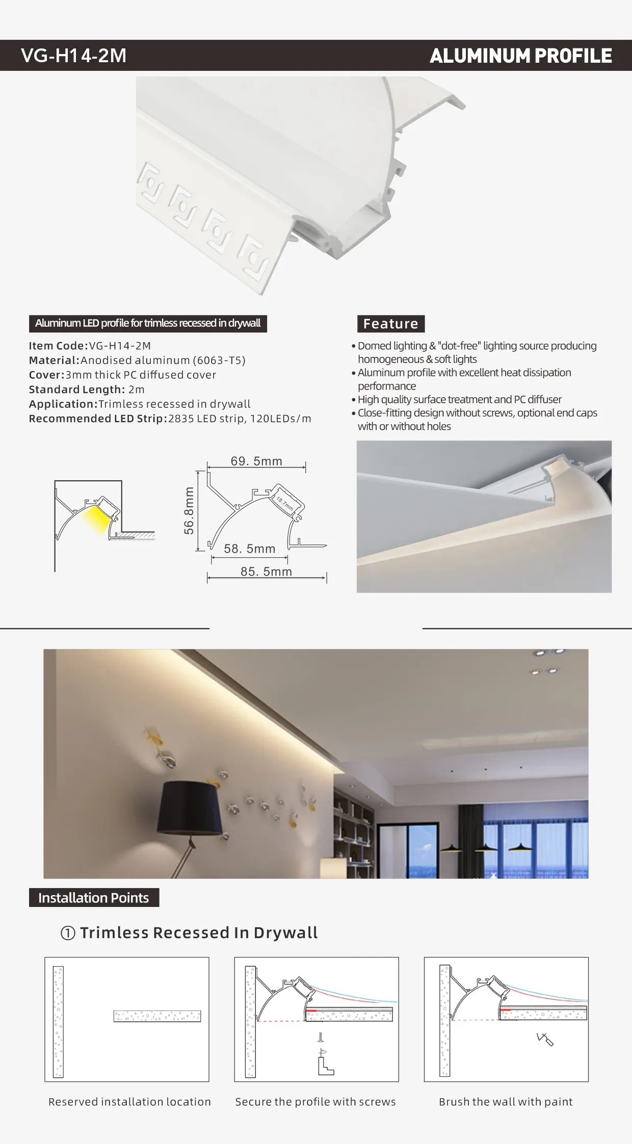 Material: Aluminum Cover: PC Inside bodysize: 58.518.72000mm Outside bodysize: 85.556.869.5mm Recommended strip: 2835 120led/m