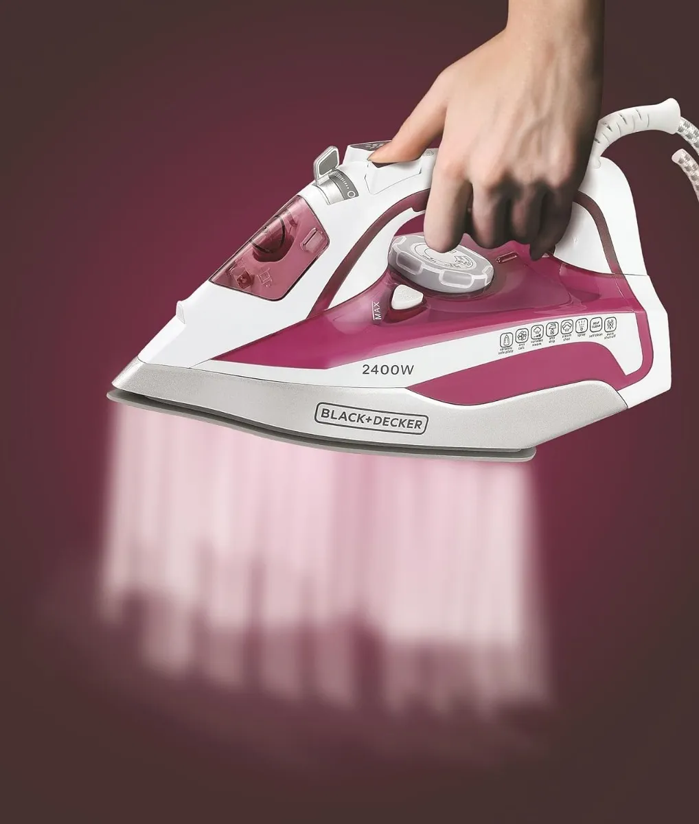 BD-X2400-B5 12000 - 2400W Power Ceramic soleplate for smoother gliding & faster ironing ? Variable steam control for versatility ? Continuous steam output of 35g/min ? Up to 90g/min steam boost to remove stubborn wrinkles ? Vertical steam for removing wrinkles on hanging clothes ? Temperature control to suit most fabrics ? Large 380ml water tank and measuring cup 99 Steam Holes for effective steam dispensation ? 2 Way auto shut-off for safety & energy saving ? Self-clean function for easy maintenance ? Anti-calc system for longer product life ? Anti-drip function to avoid water dripping ? 2m Power cord for convenience ? Indicator light & swivel cord 2400W BLACK+DECKER