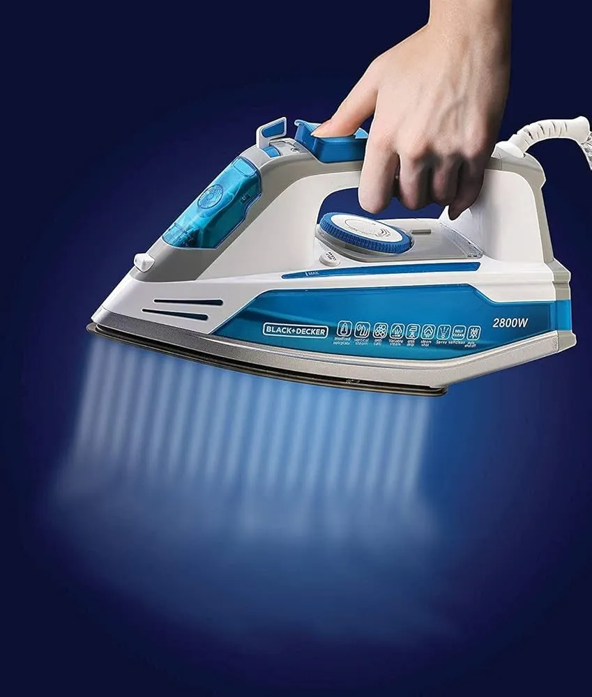 BD-X2800-B5 ? 2800W Steam Iron ? Anodized Soleplate for smooth gliding & effortless wrinkle removal Up to 110g/min steam boost to remove stubborn wrinkles Continuous steam output of 25g/min 2 Way auto shut-off for safety and energy saving Twin spray nozzle for a wider reach & best results Variable steam control for dry/steam versatility Temperature control to suit most fabrics Self-clean function for easy maintenance Rubber grip handle for better grip while ironing Large 330ml water tank and measuring cup Vertical steam for removing wrinkles on hanging clothes ? Anti-calc system for longer product life ? Anti-drip function to avoid water dripping ? 2.5m power cord for convenience 2800W BLACK+DECKER