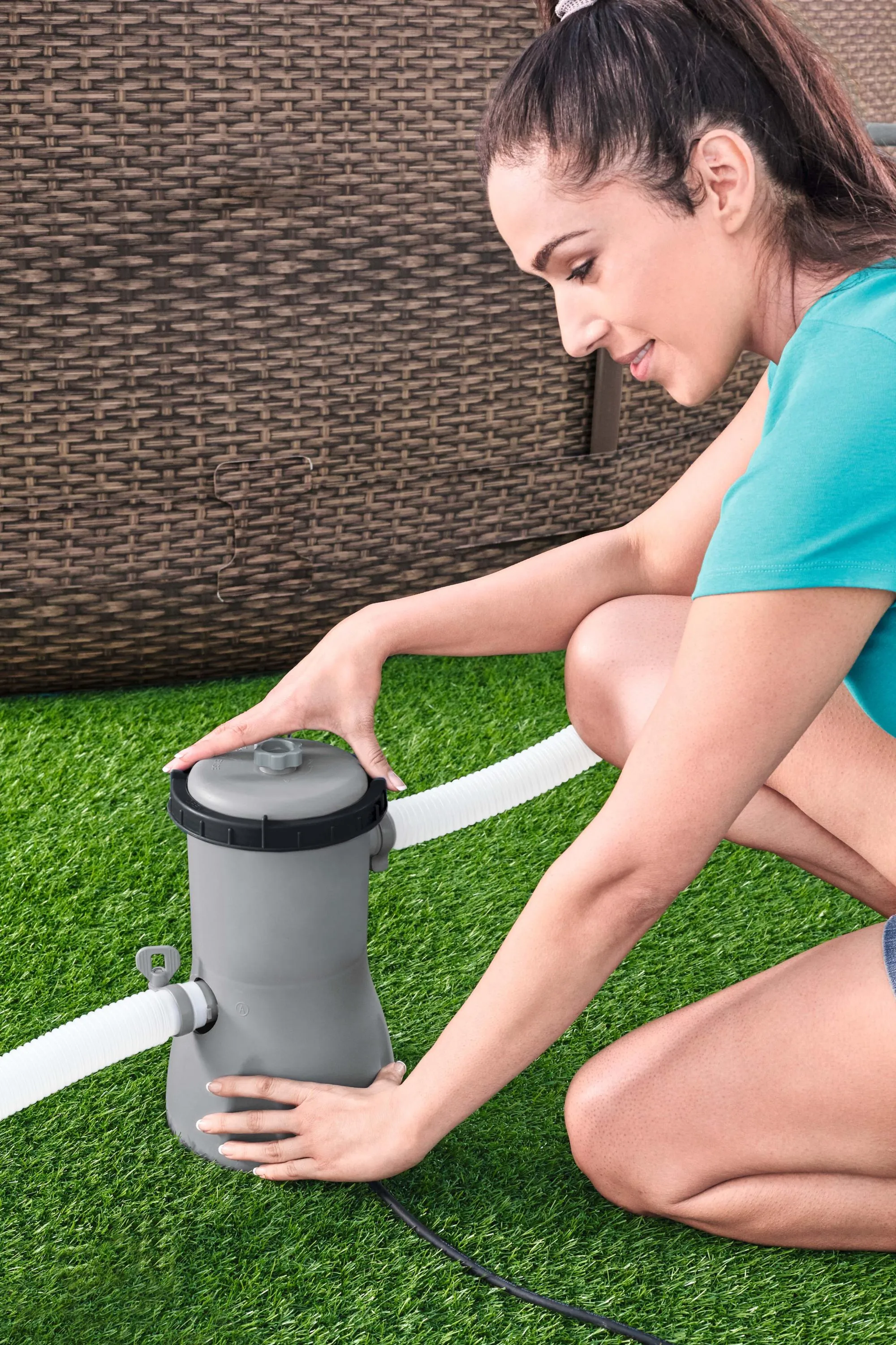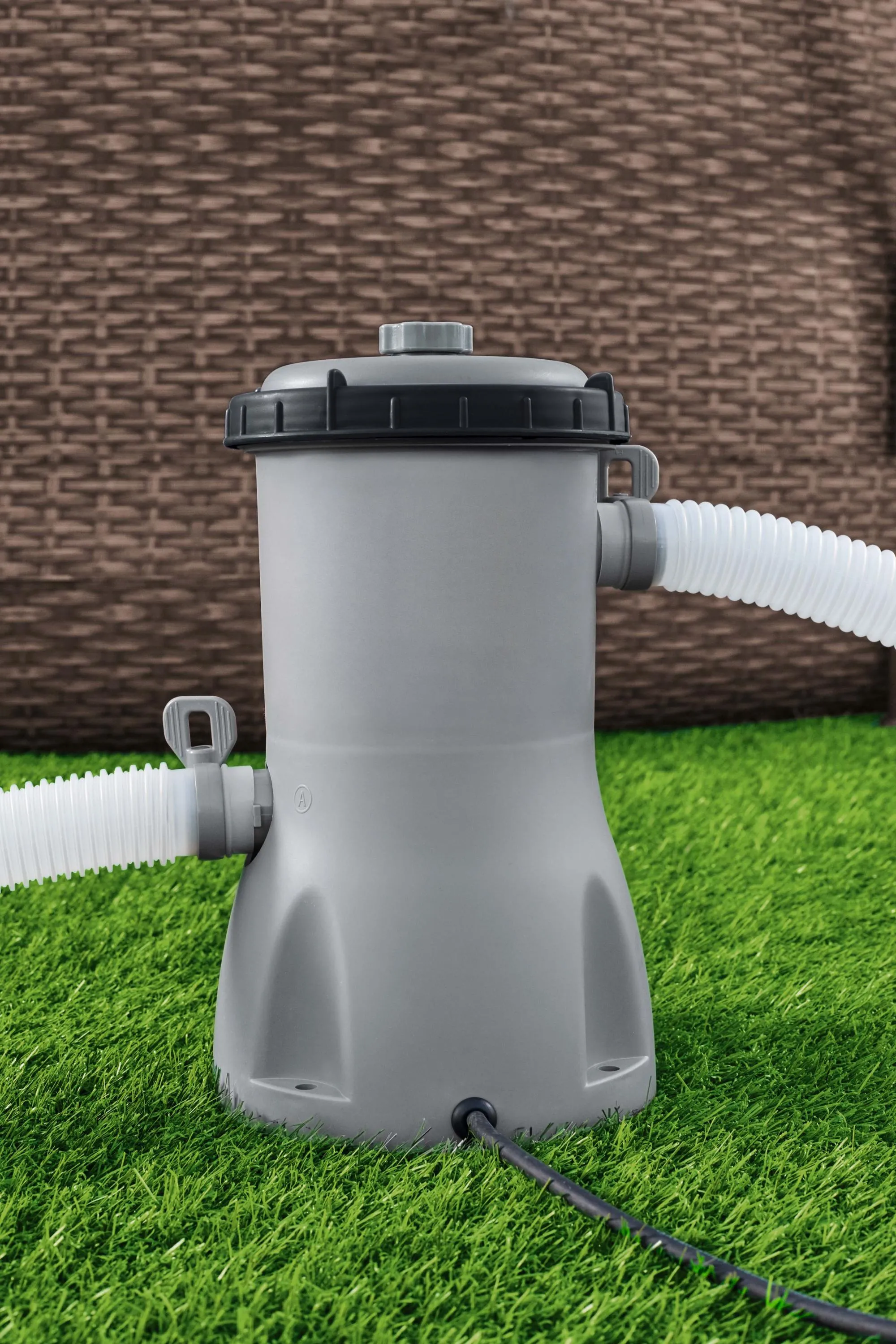 The Bestway Flowclear 800 gal / 3,028 L filtration pump is an essential accessory for people who want to keep their pool water clean and hygienic all summer long. The pool filtration pump circulates clean water by pumping it out of the pool through a filter cartridge before discharging it into the pool. The Bestway pump is delivered with two hoses, which are fixed at two different places in the pool. The end of one of the pipes is connected to the inlet of the filtration pump while the other pipe is connected to the outlet. Water is pumped out of the pool via the inlet hose before being cleaned by the filter cartridge and returned to the pool through the outlet hose. The pump operates continuously to provide clear, clean and hygienic water. The 800 gal Bestway Flowclear filtration pump. comes with an installation manual that guides you through the very simple setup process. Recommended for pools of 300-4,600 gal / 1,100-17,400 L.