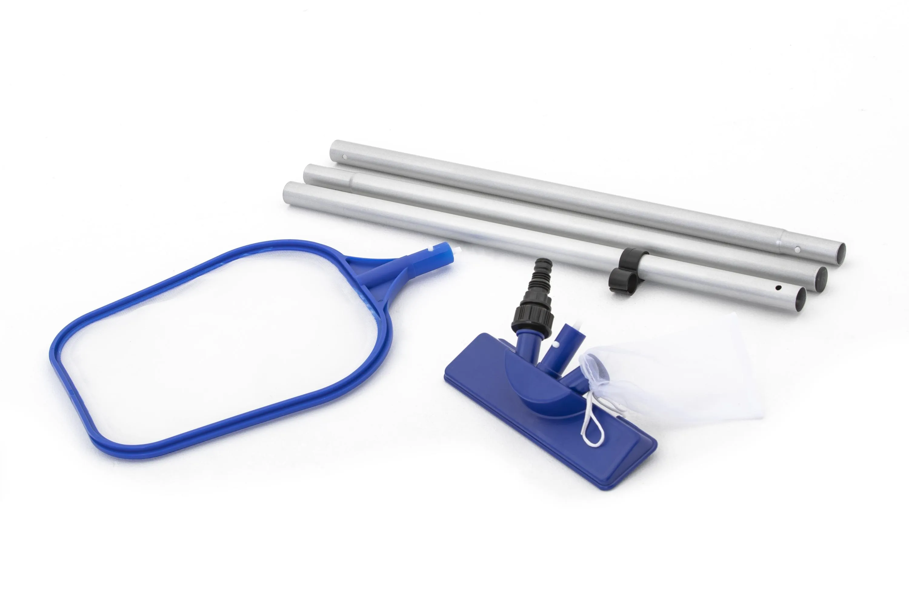 The Bestway 80 in Swimming Pool Maintenance Kit is the perfect starter kit for cleaning and maintaining 13 ft and above pools. The kit includes an 80 in aluminum pole and an interchangeable vacuum and skimmer head. The pool vacuum head connects to the pole and uses a standard garden hose for suction. No tools are required. Loose debris is sucked into a removable and reusable leaf bag. The skimmer has a durable mesh netting to collect extra unwanted debris. Keep your pool floor and walls clean all season long!