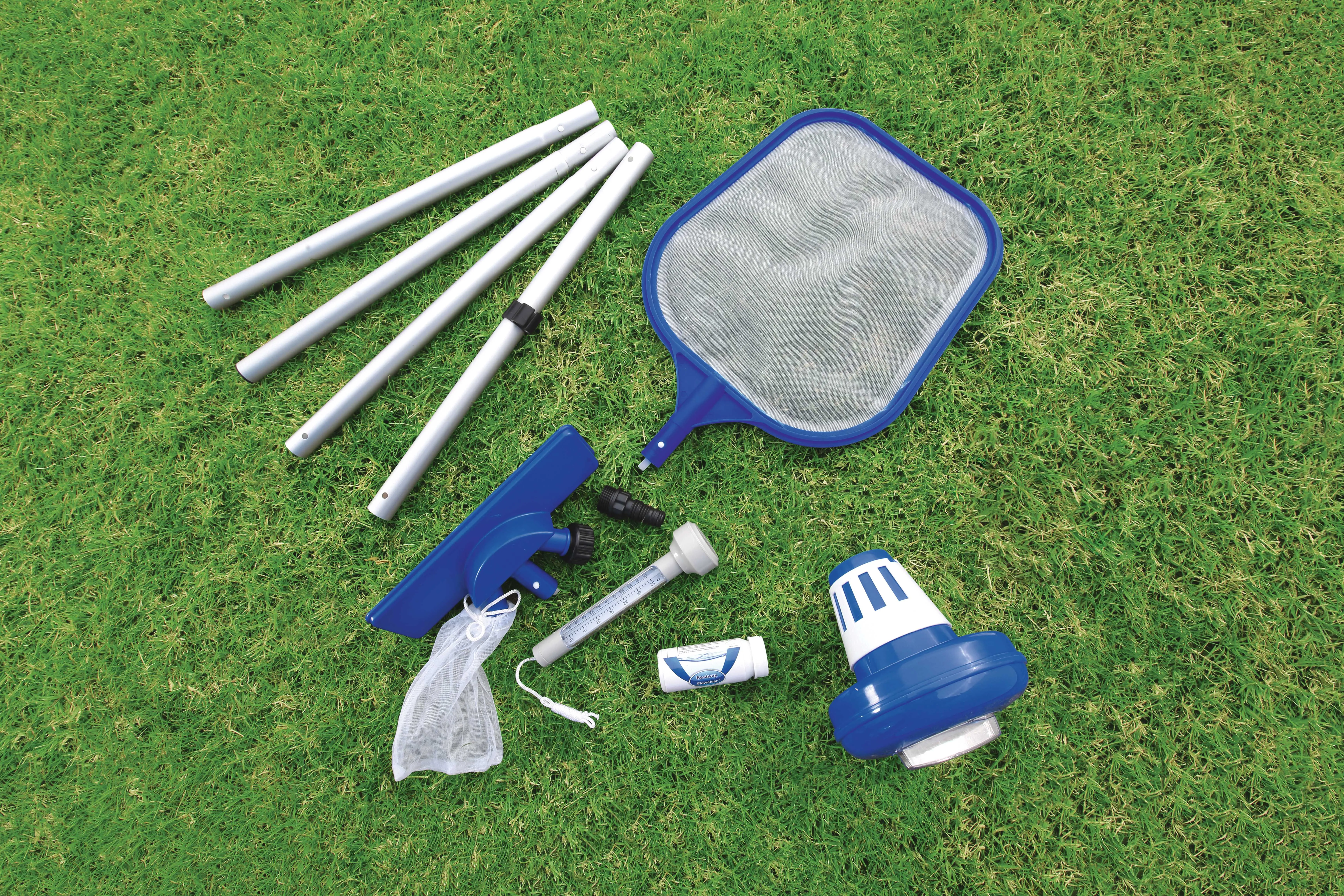 The Bestway Pool Accessories Set is the perfect kit to keep your pool sparkling clean all season long. It consists of a 63.3 in. (1.61 m) aluminum pole with an interchangeable vacuum and skimmer head, chemical floater, floating pool thermometer, test strips and heavy-duty repair patches. No tools are necessary. Collect debris from the pool walls and floor into the leaf bag which can be emptied and used time and time again. The length of the pole is designed for pools 13 ft deep and below. This is the perfect kit to keep your above ground pool clean.