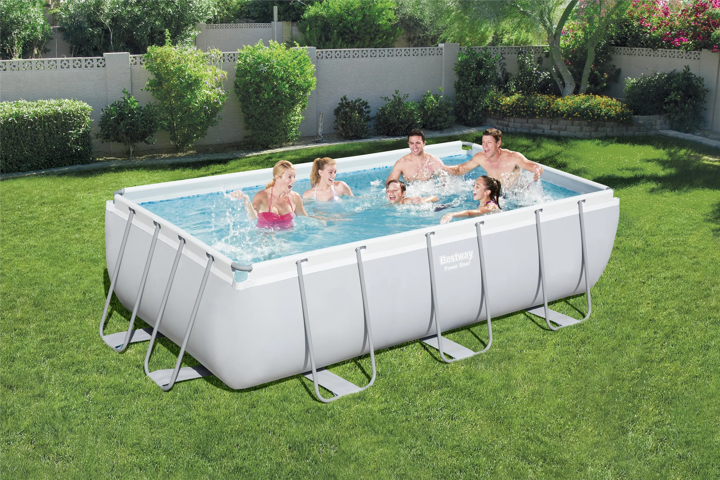 Bestway Power Steel Rectangular Frame Pool With Pump 159in x 79in x 39 1/2in - 56441. Dimensions: Length: 159in (404cm) Width: 79in (201cm) Overall Height: 39.5in (100cm) Width With Outriggers: 98.5in (250cm) Length With Outriggers: 175.2in (445cm) Water capacity at 90% full: 1,793 gallons (6,786 litres) A quality range of steel framed pools from the leading manufacturer, Bestway. Much deeper than the normal rectangular paddling pools. - Rust resistant galvanised metal frames. Easy pool construction. - Side walls are made with 3 separate layers of material. The inner layer of polyester mesh is laminated to the 2 outer heavy gauge PVC layers. - Flow control connectors for rapid connection. - Flow control drain valve, for easy draining. Valve attaches to a garden hose so that water can be drained away from the pool area. - Easy to take down for off-season storage. - No sand needed. This 159in x 79in Bestway Steel Pro Rectangular Frame POOL is supplied with FREE: 530 gallon/hour Filter Pump Installation guide DVD Safety Ladder A variety of heating options are available from the simple to use 3KW Intex heater to the high quality Elecro stainless steel heaters. A cost-effective solar panel kit is also available. Dont forget the chemical treatment kits and replacement cartridge filters, to extend the life of your pool water! Please note; if opting for the Solar Heating Kit, this pool will require two panels for optimum effect. If opting for the Bestway 1000 Gallon Flowclear Sand Filter Pump, you will additionally require one bag of Silica Sand. PLEASE NOTE: All filter pump units must be placed 2 metres away from the pool. We recommend that filtration is turned OFF when the pool is in operation. We recommend a smooth concrete slab as a suitable base- contact a reputable local builder for advice on local soil conditions. Failure to set up the pool on a flat, level compact ground could result in the pools collapse or the possibility that a person lounging in the pool could be swept out.