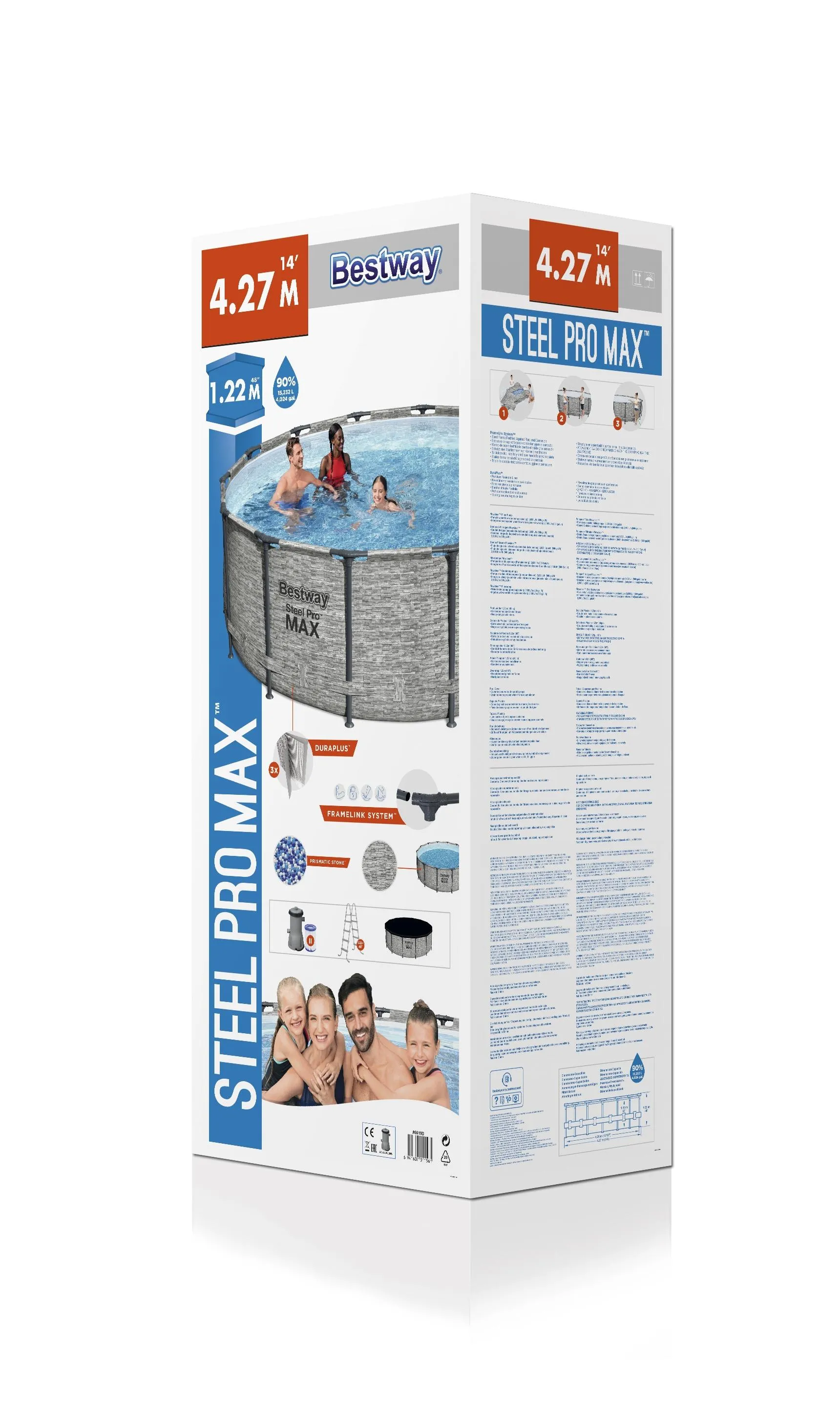 It doesnt get any better than having your very own pool in your backyard! The Bestway Steel Pro MAX Above Ground Pools offer an ultra durable option at a great price. Durable Construction: The corrosion-resistant steel frame is equipped with our FrameLink System for a sturdy and secure frame connection. The protective connectors protect from damage and rust-causing metal-on-metal contact. They are also compatible with accessory attachment, such as cup holders. The sturdy DuraPlus liner is made out of an ultra-durable 3-layer material that is reinforced for strength and puncture-resistance. DuraPlus is 15% more tear resistant, 33% more stretch resistant and 83% more puncture resistant than standard PVC, ensuring your pool will last summer after summer. Additional Features: This above ground pool set also comes stocked with a filter pump, a safety ladder and a pool cover. The flip and lock ladder design prevents unsupervised access to the pool. Plus, this pool is very simple to set up and to take down for off-season storage. No tools are required, and a hose connects to the built-in flow control valve to quickly and easily drain away pool water. Spend your summer on the water in this Bestway Steel Pro MAX pool!