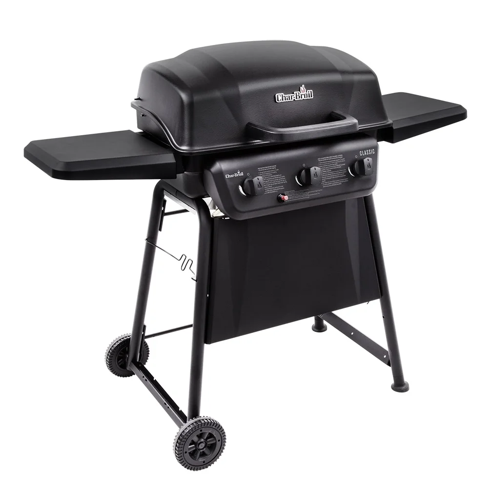The Char-Broil Classic 360 is a 3-burner gas grill that delivers 30,000 BTU?s of heat across the 360 square inch cooking surface, to accommodate large meals the whole family will enjoy. Includes an 8,000-BTU side burner, ideal for sauces and sides. The cooking surface measures 26-inches wide by 14-inches deep, and features porcelain-coated grates, which help prevent food from sticking and are easy to clean. On the inside, three stainless steel in-line burners are durable and deliver strong cooking performance.439048