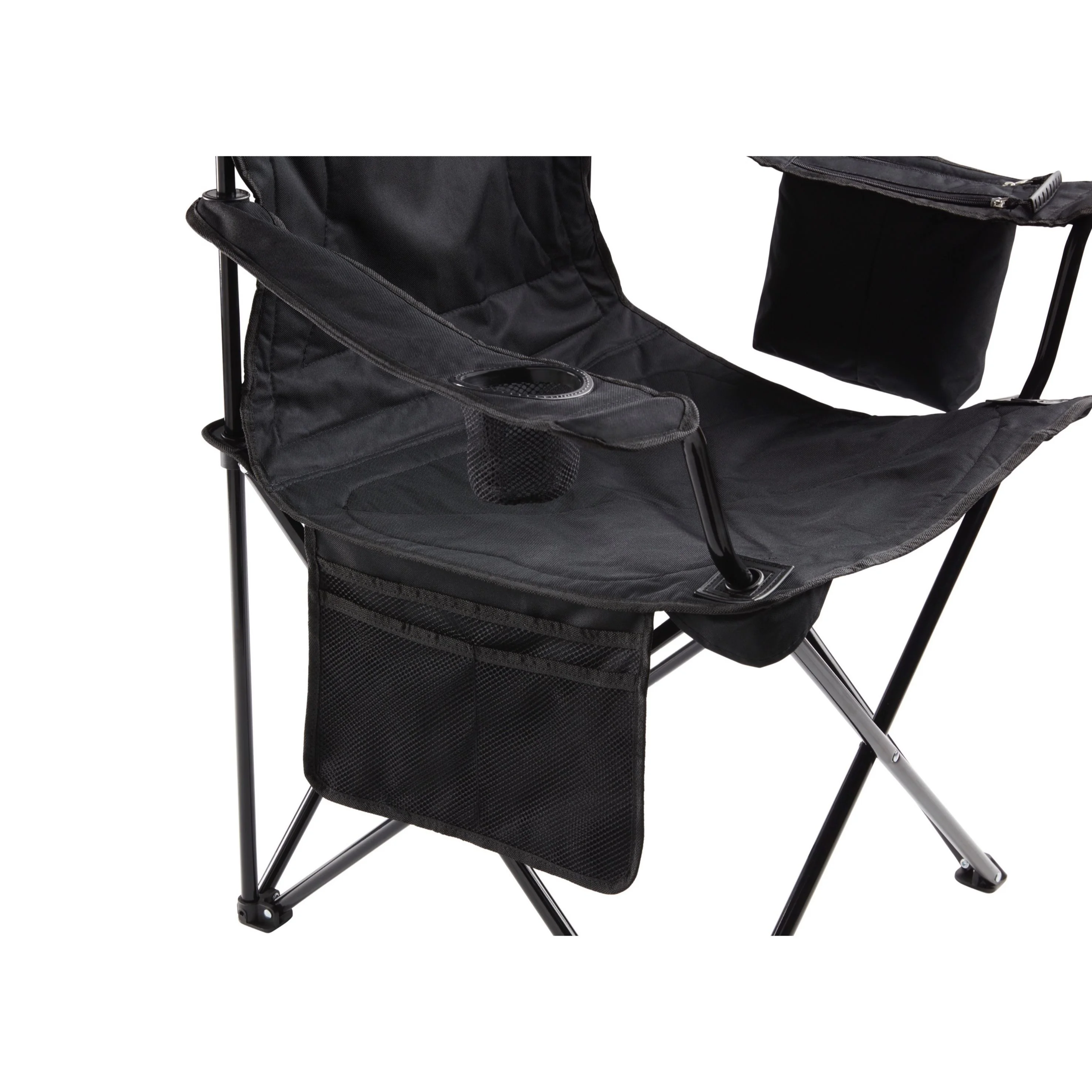 Always have a cold drink within easy reach at the campsite, tailgate, or kids' ball game thanks to the cooler built into the armrest of the Camping Chair with Built-In 4-Can Cooler. The fully cushioned seat and back mean you'll enjoy hours of relaxing comfort." Built-in cooler: chill up to four cans from the armrest " Padded seat and back for lasting comfort " includes storage bag " Weight capacity: 147 kg / 325 lb " Fabric: 600d poly " Frame: Steel