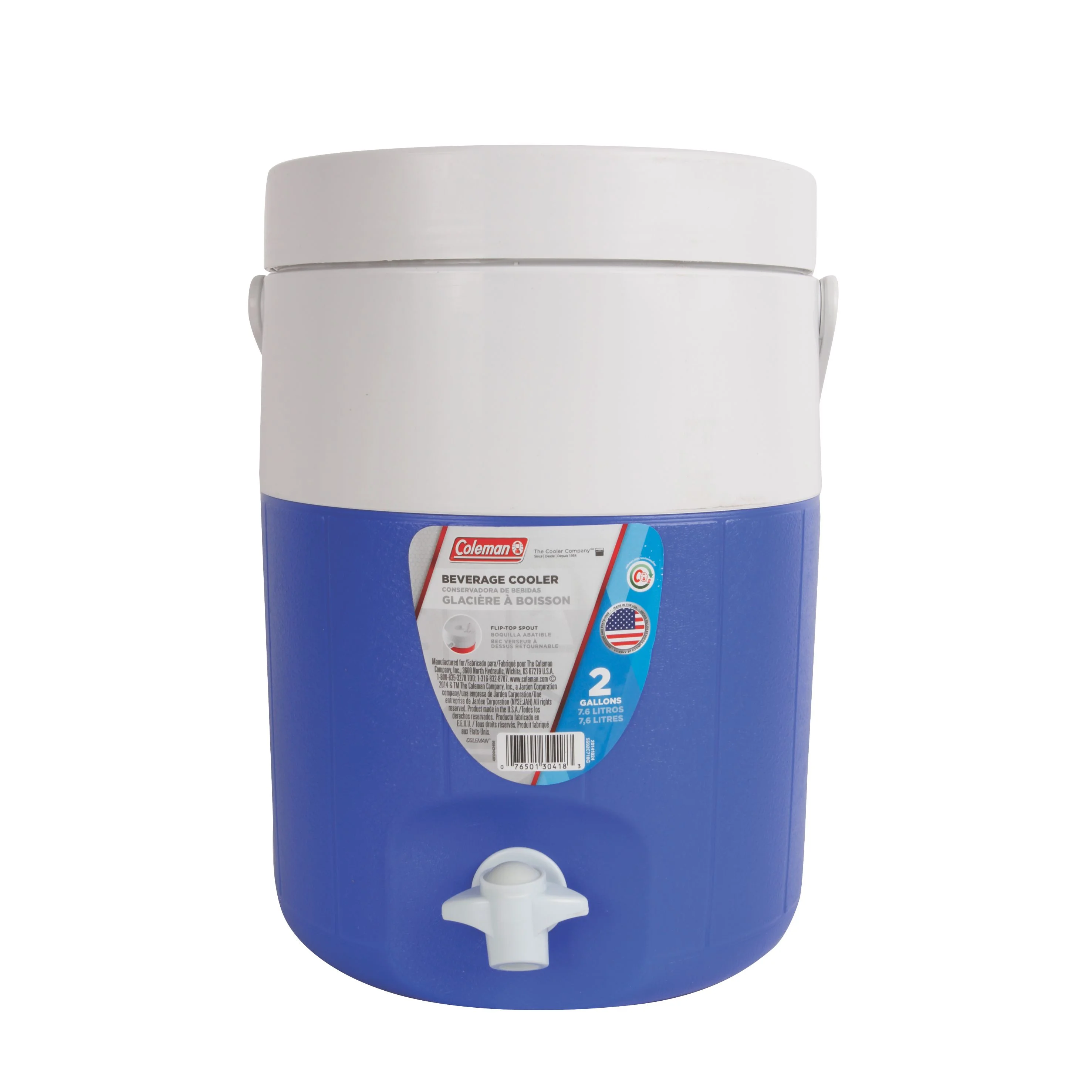 Keep the group cool and hydrated on sweltering days with a Coleman" 2 Gallon Beverage Cooler. The wide mouth top makes for easy filling, including adding ice by the handful. Two dispensing options give you added versatility with this beverage cooler. Either place it on a table top or bench and let entire groups fill their cups from the easy-use faucet, or open the flip spout to grab a quick drink without a cup. Either way, the bail handle makes carrying easy, and the screw-top lid stays secure, so no matter where you go you'll always have a refreshing drink ready for you.Easy-use faucet lets you conveniently fill your drink Flip spout makes it easy to grab a drink then securly close your beverage cooler Screw-top lid stays secure on your adventures Bail handle allows for easy carrying with just one hand Wide-mouth top for easy filling, especially with ice Low CO2 insulation for reduced carbon emissions from foam manufacturing Made in the USA