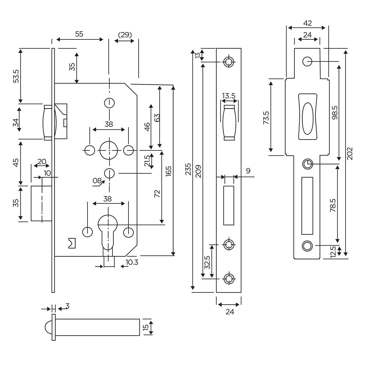 Material: Stainless Steel Grade: SUS 304 Finish : Satin Stainless Steel Distance: 72 mm Backset Size: 55 mm Forend Plate Type: Square 2-Turn Dead Bolt Suitable For Wooden, Metal, Fire, Smoke & Swing Doors