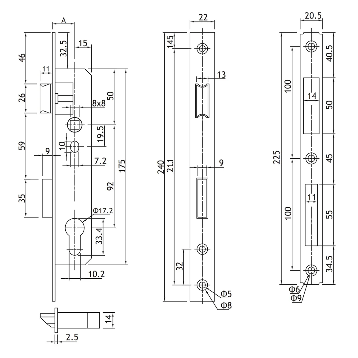 Material: Stainless Steel Grade: SUS 304 Finish: Satin Stainless Steel Distance: 92 mm Follower: 8x8 mm Forend Plate Type: Square 1-Turn Dead Bolt Reversible Latch bolt Suitable For Wooden, Metal & Swing Gates
