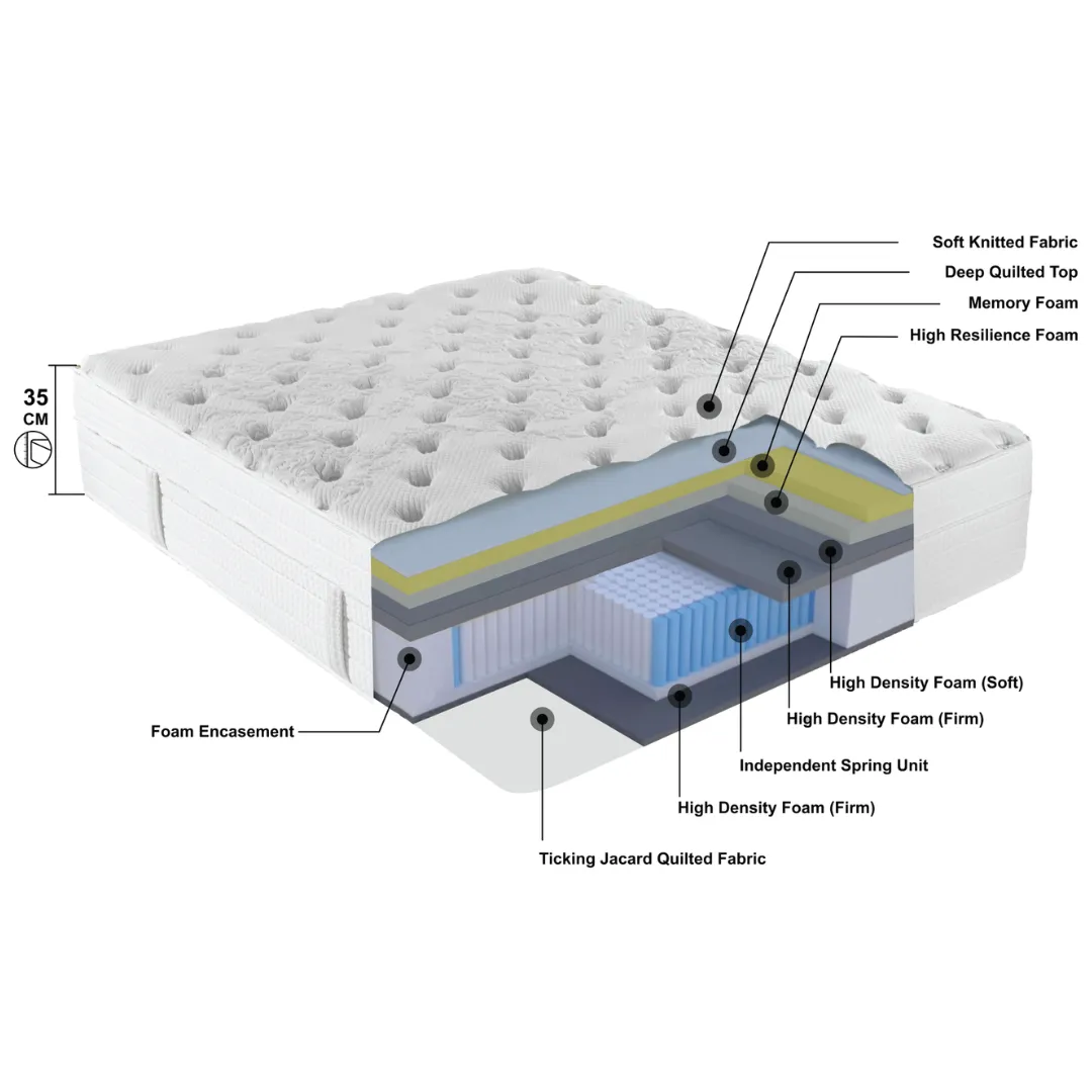 Dream Haven mattress providing pressure relief during sleep, The deep quilted top layer provides support to all area of your body. Due to it’s open-cell technology, Air is allowed to circulate freely throughout this product, Enabling you to ramain cool and comfortable throughout the entire night. Future, When couple sleep together on it, Do not experience motion transfer. This mattress stand in the range of upper class mattress. Have it in your collection to stay confidentwhile sleeping. Additional Information Quilting Type - Deep Quilting Fabric Type - Soft Knitted Fabric Core Type - Independent Spring Unit (Pocket Spring) Comfort Layer - Memory Foam Foam Encasement - Yes Cover Type - Euro Top Mattress Height - 35cm SOFT KNITTED FABRIC - DEEP QUILTED TOP MEMORY FOAM HIGH RESILIENCE FOAM HIGH DENSITY FOAM (SOFT) HIGH DENSITY FOAM (FIRM)