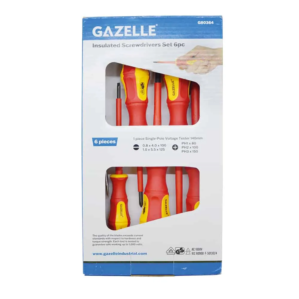 Gazelle 1000V Insulated Screwdriver Set, 6-Pieces - includes Slotted, Phillips, Single-Pole Voltage Tester and Plastic Case