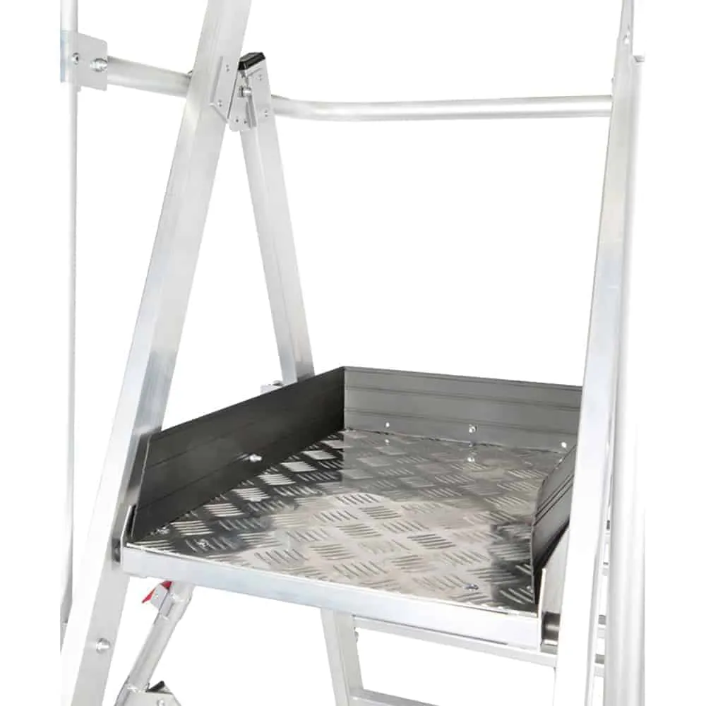 Double guard rail with a locking gate on the platform Extended guard rail for organizing tools and accessories Large standing 610 mm x 450 mm platform ensures maximum work safety and comfortable standing. Easy height adjustment rung by rung Fitted with two castors for easy movement Swung-out stabilizers for maximum stability Telescopic feature enhances stability of ladder when used on steps and stairways Compact dimensions when folded up for easy transport and storage.