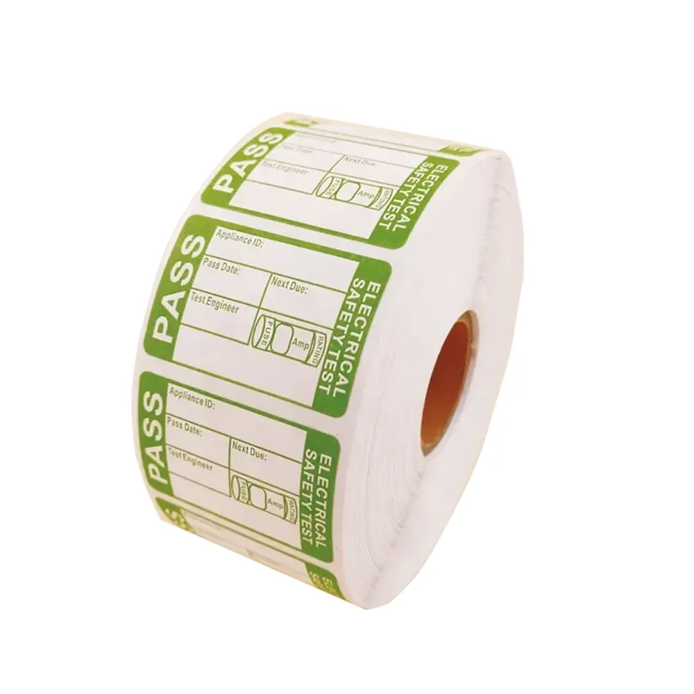 1000x Pass Stickers Roll 200x Fail Sticker Roll Easy peel adhesive labels for PAT tested equipment Polyvinyl labels for extreme durability Each pass label contains space for writing a test date, next due date, fuse rating, appliance ID and the name of the person who carried out the PAT test Each fail label contains space for writing a test date, appliance ID and the name of the person who carried out the PAT test