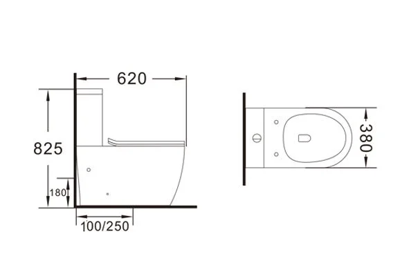 Type: Washdown two-piece toilet; Material: Ceramic; Size:620x380x825mm ; S-trap:100/250mm Roughing-in; P-trap:180mm Roughing-in UF Seat cover