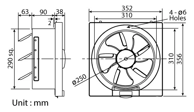Exhaust type The fan shall be suitable for wall mounting Condenser motor with thermo cut-off Well lubricated bearing for long life operation Propeller fan incorporated with"Advanced blade design"enables powerful Airflow at low noise Automatic shutter Orifice equipped with oil cup collects oil drops effectively Pre-painted steel frame and shutter strengthen product durability Installation size = 300 x 300 mm AMCA Certified"