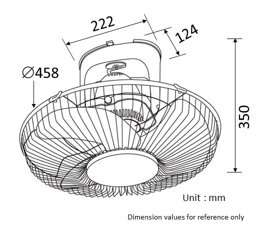 The fan shall be suitable for ceiling mounting Oscillation over 360"C 5-speed and on/off by wired regulator Easy angle adjustment Metal blade Color option: blue