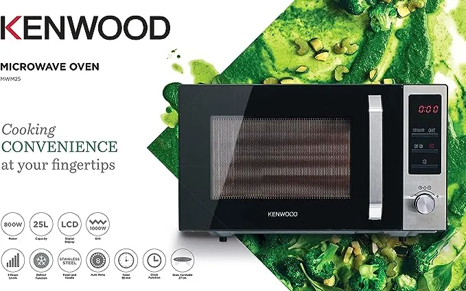 KENWOOD 25L Microwave Oven with Grill, Digital Display, 5 Power Levels, Defrost Function, Stainless Steel, Auto Menu, 95 Minutes Timer, Clock Function 800W MWM25.000BK Black/Silver