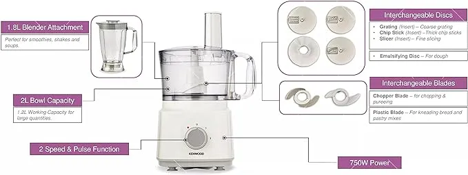 Kenwood Food Processor 750W Multi-Functional With 3 Interchangeable Disks, Blender, Whisk, Dough Maker Fdp03 White