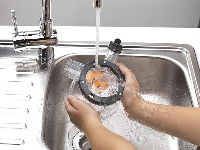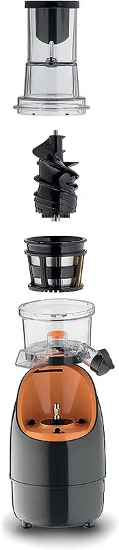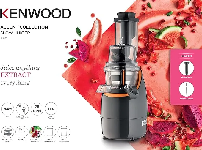 KENWOOD Slow Juicer Cold Press 200W Juice Extractor with 65mm Wide Feed Tube, 1 Speed + Reverse, Jug, Pulp Container, Anti Drip, Cleaning Brush, Food Pusher/Tamper JMP65.000GO Grey/Orange