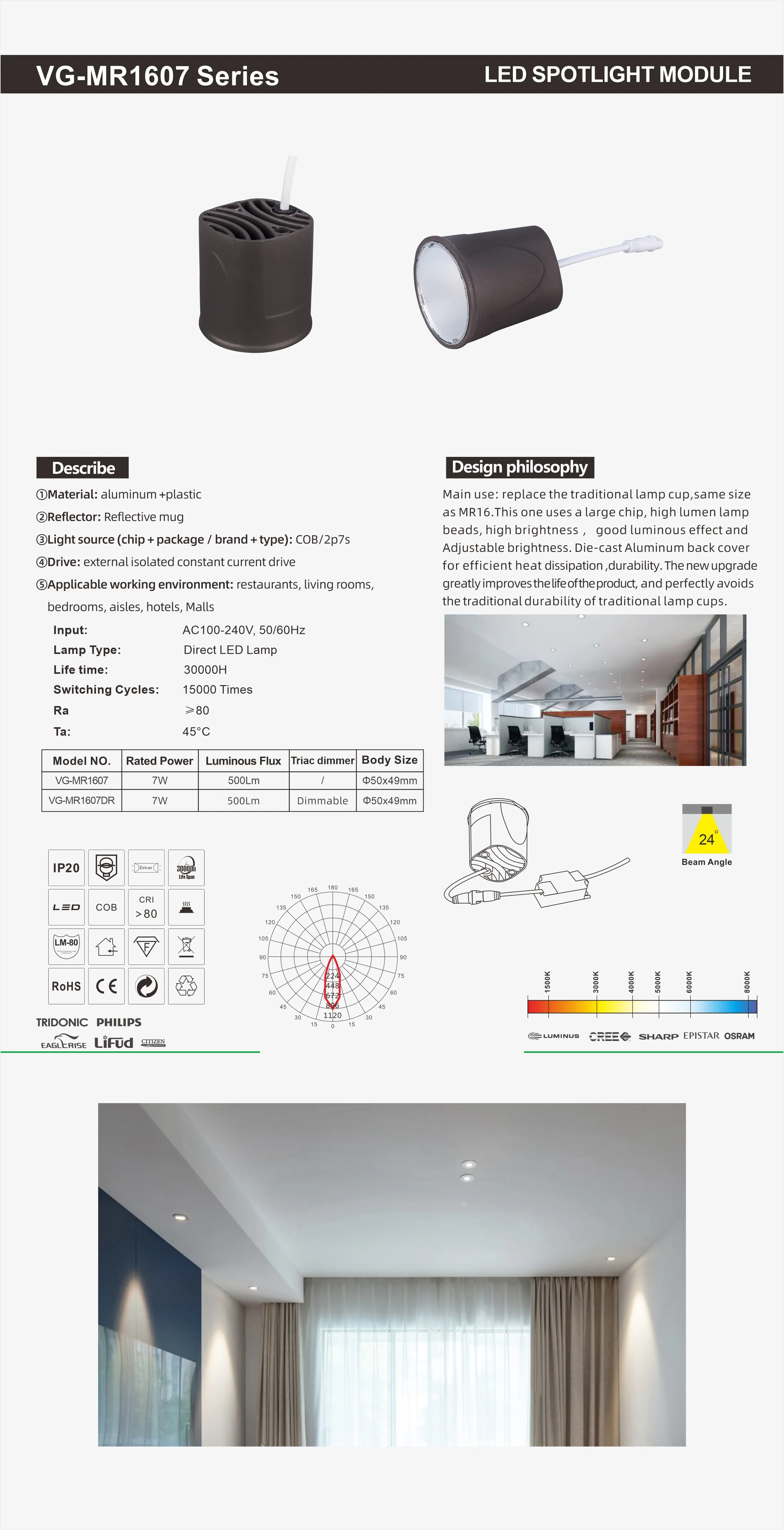 Power: 7w 24" Voltage: AC220-240V 50/60Hz Material: Aluminum + PC Body color: GY CCT: Color change LM: 500lm Size: ?50*49mm CRI > 80 Ra ? 80