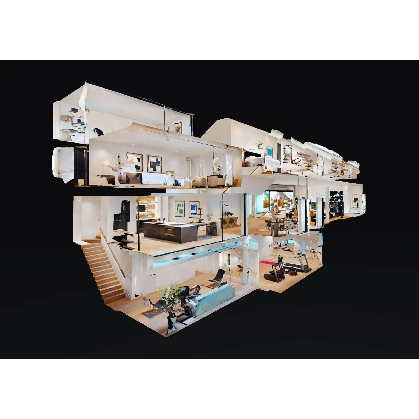The Pro2 can shoot a 360" scan of a physical space in about 20 seconds, sends it to your iPhone or Android phone, and the Matterport software scans the data and stitches the images into a 3D model and 360" panorama. The software allows you to create walkthroughs, tours, schematic maps, and professional quality 2D still capture output. The Matterport cloud service requires a separately obtained login and provides collaboration, customization such as metadata tags, modelling file export, and editing tools.
