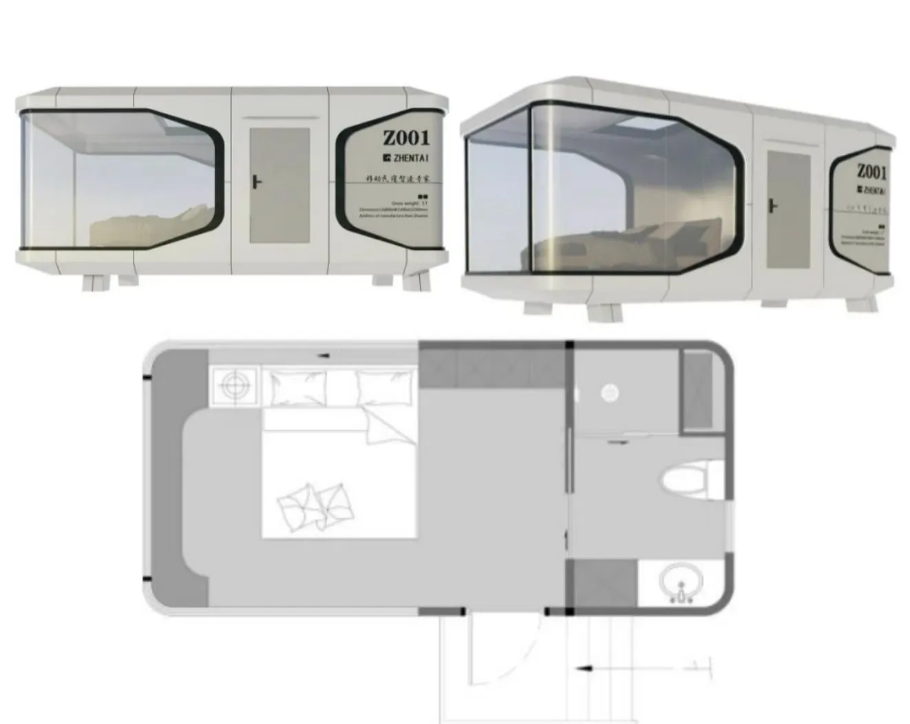MODLE : MOBILE CABINE Z01, Size: L6800mm, W3300mm, H3200mm, Area: 22.44m², Weight: 5TON Major :- structure steel-frame construction, Aluminum veneer housing(2.5thickaluminum veneer), The shell is filled with thermal insulation, Exterior glass(Tempered insulating glass), skylight glass(laminated glass), Superior entry door(Intelligent door lock), Outdoor ambient light belt(waterproof), Load bearing support foot brace Indoor switch gear :- Composite wood-plastic flooring/Bamboo and wood fiber integrated ceiling/shingle/Indoor smart light with down light/Indoor smart blackout curtains/Electric sunshade for sunroof/socket panel(Brand switch panel)/Bathroom advanced carbon fiber board interior wall/Bathroom advanced non-slip tile floor Bathroom Hardware:- Bathroom brand basin/smart mirror/bibcock/sprinkler/floor drain/commodity shelf /Bathroom lighting ventilation heating three-in-one bath bully/Toilet brand smart toilet Equipment:- 2p air conditioner(on-hook)/water heater(50L)/Intelligent voice control system/Electric curtain intelligent control system/insert card for power/ake the card power off control system {Shipment details: we do And the house shipped by sea, Product price and shipping cost may fluctuate due to market demand /season/weather. Product time within 15 days, shipment time on the sea 30 days, so total within 50 days}