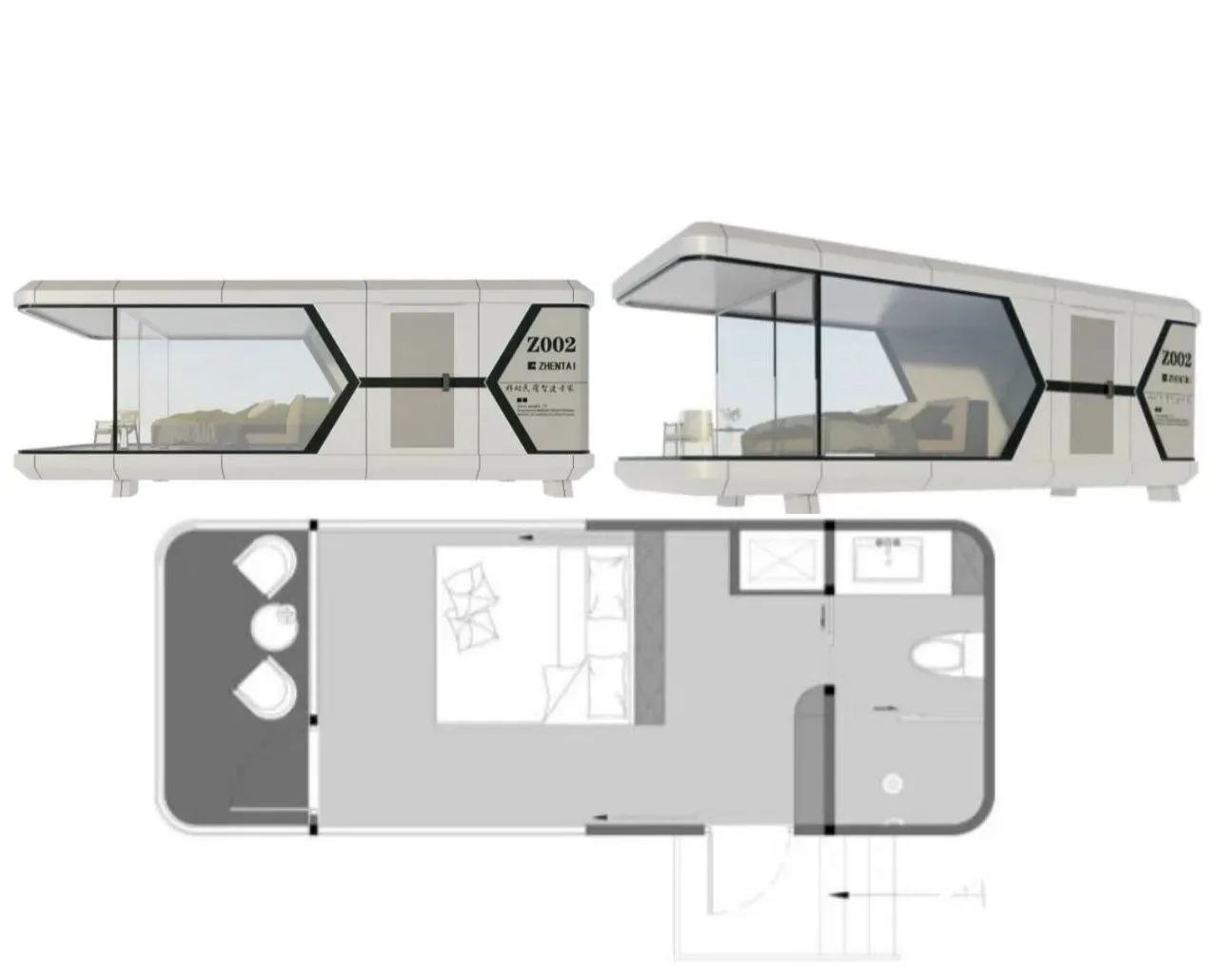 MODLE : MOBILE CABINE Z02, Size: L8500mm, W3300mm, H3300mm, Area: 28.05m², Weight: 7TON MAJOR:- structure steel-frame construction, Aluminium veneer housing(2.5 thick aluminumveneer), The shell is filled with thermal insulation, Exteriorglass(Tempered insulating glass), skylight glass(laminated glass), Superior entry door(Intelligent door lock), Outdoor ambient light belt(waterproof), Load bearing support foot brace INDOOR SWITCH GEAR:- Composite wood-plastic flooring/Bamboo and wood fiber integrated ceiling/shingle/Indoor smart light with down light/Indoor smart blackout curtains/Electric sunshade for sunroof/socket panel(Brand switch panel)/Bathroom advanced carbon fiber board interior wall/Bathroom advanced non-slip tile floor BATHROOM HARDWARE:- Bathroom brand basin/smart mirror/bibcock/sprinkler/floor drain/commodity shelf /Bathroom lighting ventilation heating three-in-one bath bully/Toilet brand smart toilet EQUIPMENT:- 2p air conditioner(on-hook)/water heater(60L)/Intelligent voice control system/Electric curtain intelligent control system/insert card for power/ake the card power off control system {Shipment details: we do And the house shipped by sea, Product price and shipping cost may fluctuate due to market demand /season/weather. Product time within 15 days, shipment time on the sea 30 days, so total within 50 days}