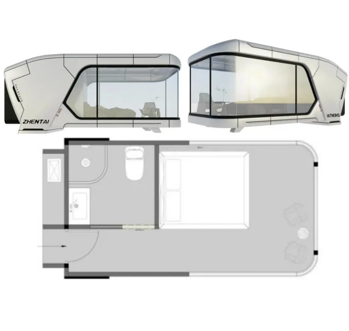 MODLE : MOBILE CABINE Z04, Size: L6500mm, W3200mm, H3000mm, Area: 20.8m², Weight: 5TON Major:- structure steel-frame construction, Aluminum veneer housing(2.5thickaluminum veneer), The shell is filled with thermal insulation, Exterior glass(Tempered insulating glass), skylight glass(laminated glass), Superior entry door(Intelligent door lock), Outdoor ambient light belt(waterproof), Load bearing support foot brace Indoor Switch Gear:- Composite wood-plastic flooring/Bamboo and wood fiber integrated ceiling/shingle/Indoor smart light with down light/Indoor smart blackout curtains/Electric sunshade for sunroof/socket panel(Brand switch panel)/Bathroom advanced carbon fiber board interior wall/Bathroom advanced non-slip tile floor Bathroom Hardware:- Bathroom brand basin/smart mirror/bibcock/sprinkler/floor drain/commodity shelf /Bathroom lighting ventilation heating three-in-one bath bully/Toilet brand smart toilet Equipment:- 2p air conditioner(on-hook)/water heater(50L)/Intelligent voice control system/Electric curtain intelligent control system/insert card for power/ake the card power off control system {Shipment details: we do And the house shipped by sea, Product price and shipping cost may fluctuate due to market demand /season/weather. Product time within 15 days, shipment time on the sea 30 days, so total within 50 days}
