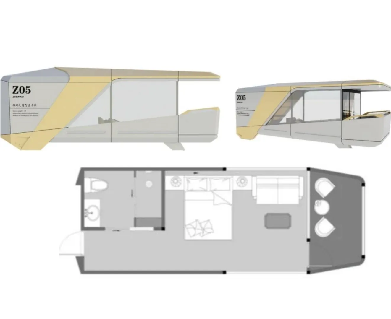 MODLE : MOBILE CABINE Z05, Size: L8500mm, W3300mm, H3150mm, Area: 28m², Weight: 7TON major structure steel-frame construction, Aluminum veneer housing(2.5thickaluminum veneer), The shell is filled with thermal insulation, Exterior glass(Tempered insulating glass), skylight glass(laminated glass), Superior entry door(Intelligent door lock), Outdoor ambient light belt(waterproof), Load bearing support foot brace indoor switch gear Composite wood-plastic flooring/Bamboo and wood fiber integrated ceiling/shingle/Indoor smart light with down light/Indoor smart blackout curtains/Electric sunshade for sunroof/socket panel(Brand switch panel)/Bathroom advanced carbon fiber board interior wall/Bathroom advanced non-slip tile floor Bathroom Hardware:- Bathroom brand basin/smart mirror/bibcock/sprinkler/floor drain/commodity shelf /Bathroom lighting ventilation heating three-in-one bath bully/Toilet brand smart toilet Equipment:- 2p air conditioner(on-hook)/water heater(50L)/Intelligent voice control system/Electric curtain intelligent control system/insert card for power/ake the card power off control system {Shipment details: we do And the house shipped by sea, Product price and shipping cost may fluctuate due to market demand /season/weather. Product time within 15 days, shipment time on the sea 30 days, so total within 50 days}