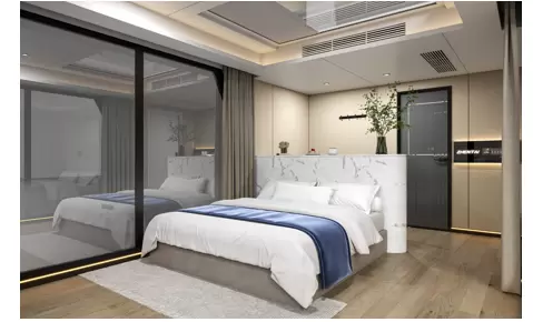 MODLE : MOBILE CABINE Z06, Size: L11500mm, W3300mm, H3200mm, Area: 37.95m² Major:- structure steel-frame construction, Aluminum veneer housing(2.5thickaluminum veneer), The shell is filled with thermal insulation, Exterior glass(Tempered insulating glass), skylight glass(laminated glass), Superior entry door(Intelligent door lock), Outdoor ambient light belt(waterproof), Load bearing support foot brace Indoor Switch Gear:- Composite wood-plastic flooring/Bamboo and wood fiber integrated ceiling/shingle/Indoor smart light with down light/Indoor smart blackout curtains/Electric sunshade for sunroof/socket panel(Brand switch panel)/Bathroom advanced carbon fiber board interior wall/Bathroom advanced non-slip tile floor Bathroom Hardware:- Bathroom brand basin/smart mirror/bibcock/sprinkler/floor drain/commodity shelf /Bathroom lighting ventilation heating three-in-one bath bully/Toilet brand smart toilet Equipment:- 2p air conditioner(on-hook)/water heater(50L)/Intelligent voice control system/Electric curtain intelligent control system/insert card for power/ake the card power off control system the shipment by fully assembled, no need to do assemble any more on site. {Shipment details: we do And the house shipped by sea, Product price and shipping cost may fluctuate due to market demand /season/weather. Product time within 15 days, shipment time on the sea 30 days, so total within 50 days}