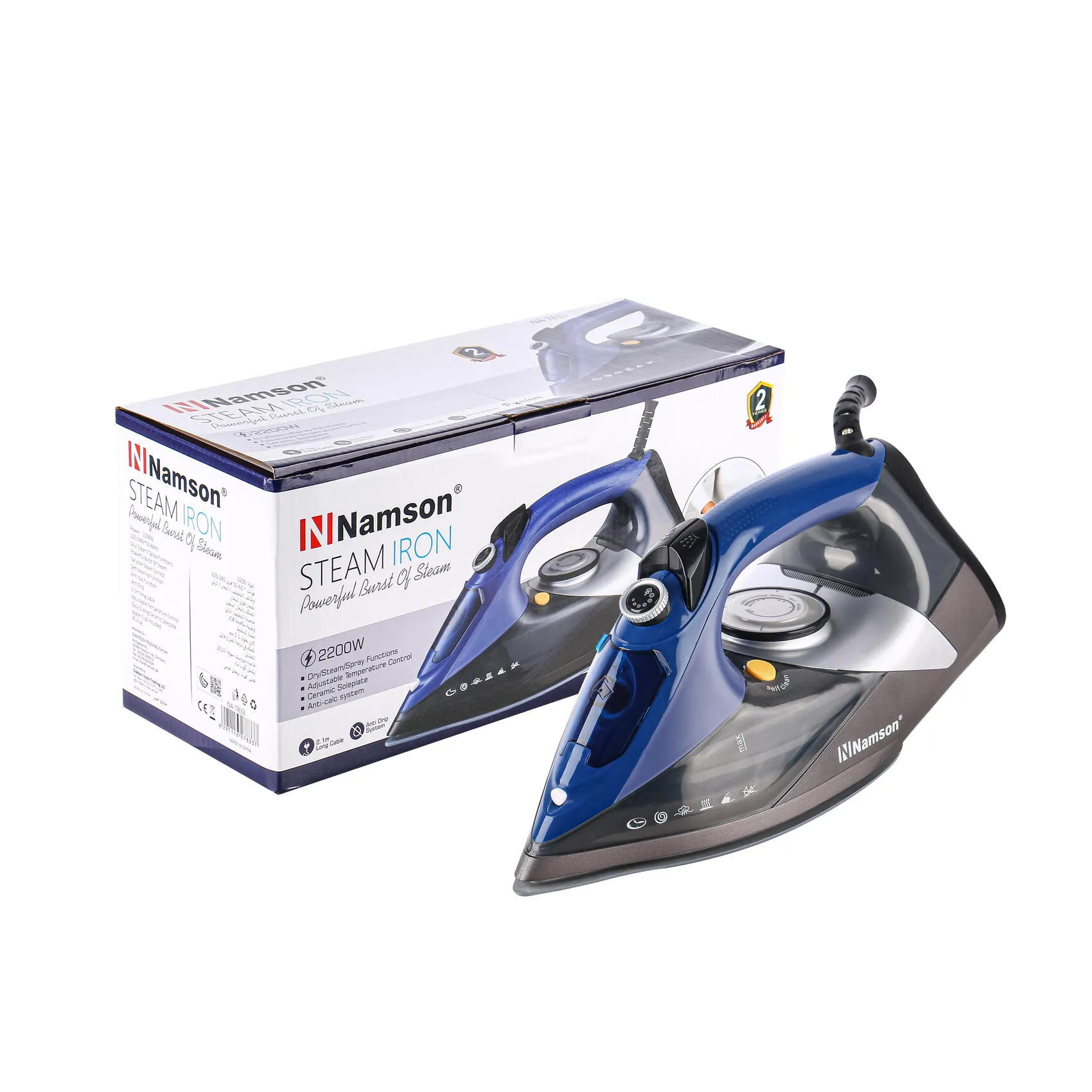 BRAND: NAMSON item no.: NA-7833 MATERIAL: CERAMIC SOLEPLATE COLOR: BLACK AND BLUE PRUDOCT DIMENSIONS: HEIGHT 15 CM X LENGTH 31 CM X WIDTH 13 CM PACKAGE DIMENSIONS: HEIGHT 16 CM X LENGTH 34 CM X WIDTH 13 CM GROSS WEIGHT 1.42 KG POWER: 2200 W PLUG TYPE: 3PIN British standard plug POWER CONSUMPTION: 220V-240V 50/60HZ . DRY/ STEAM/ SPRAY FUNCTIONS . ADJUSTABLE TEMPERATURE CONTROL . CERAMIC SOLEPLATE . VARIABLE STEAM CONTROLLER . ANTI CALC SYSTEM . ANTI DRIP SYSTEM . AUTO SHUT OFF SYSTEM NAMSON STEAM IRON (POWERFUL BURST OF STEAM) IN AN INSTANT IRONS YOUR CLOTHES. THANKS TO CERAMIC PLATES YOU CAN IRON DIFFERENT TYPES OF CLOTHES PERFECTLY. THE ITEM COMES WITH 3 FUNCTIONS, SPRAYING, STEAMING AND DRYING. THE 2200 W OF POWER IN THE NAMSON STEAM IRON ALLOWS FOR THE RIGHT TEMPERATURE TO BE REACHED VERY QUICKLY. THE ITEM IS VERY EASY TO USE, YOU JUST NEED TO PLUG IT IN, ADJUST THE TEMPERATURE DIAL TO YOUR DESIRED HEAT LEVEL AND WAIT VERY SHORTLY. THE NAMSON STEAM IRON HAS A HEAT RESISTANT HANDLE WHICH ALLOWS FOR AN EASY OPERATING OF THE ITEM. ALSO, THE CONTROL LAMP WILL BE ON TO INDICATE WHEN THE IRON IS HOT, AS A SAFETY MEASURE SO THAT IT IS NOT TOUCHED ACCIDENTALLY. THE ITEM ALSO HAS An AUTO SHUT OFF SYSTEM, WHICH ENSURES THAT THE ITEM DOES NOT STAY ON AFTER USE. THE METHOD TO MANUALLY TURN OFF THE HEAT IS ALSO VERY SIMPLE. JUST TURN THE DIAL BACK DOWN AND WAIT FOR IT TO COOL. THE ITEM ALSO HAS A ANTI CALC AND DRIP SYSTEM WHICH PREVENTS GARMENTS FROM GETTING DAMAGED FROM CALC BUILDUP OR WATER DROPLETS. THE ITEM ALSO COMES WITH A MINI BEAKER FOR EASY REFILLING.