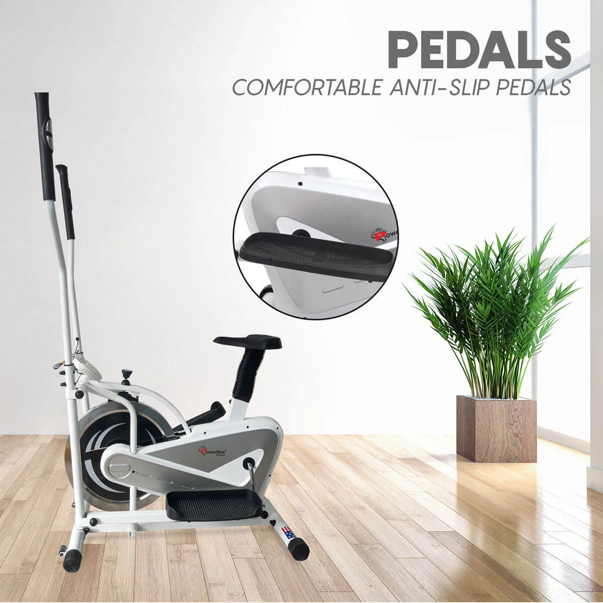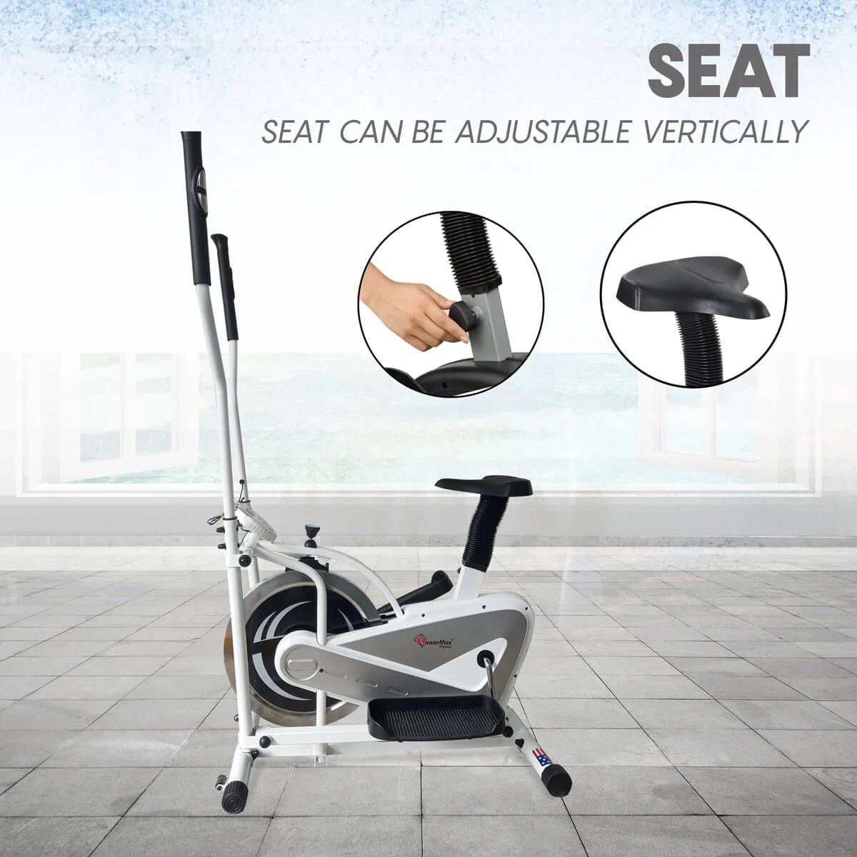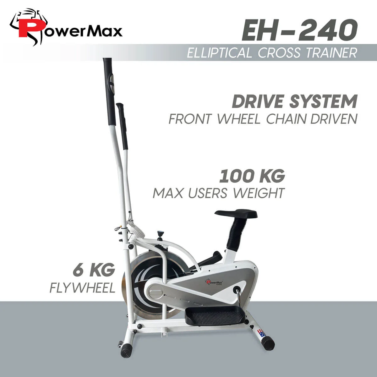 PowerMax fitness EH-240 Elliptical Cross Trainer is perfect for apartments or limited areas, where space saving is a priority. This elliptical will give you an excellent upper and lower body workout. Dual Action arms work the arms and shoulders and a solid steel flywheel makes for smooth striding for a lower body workout. The larger pedal design with ridge construction will prevent foot slippage when exercising. Enjoy a total body cardio workout without trudging to the gym day after day with PowerMax fitness EH-240 Elliptical Cross Trainer. As a result, users can vary their workout routines depending on the goals they're trying to achieve. Finally, the unit's seat adjusts vertically to fit users of different heights and weights.
