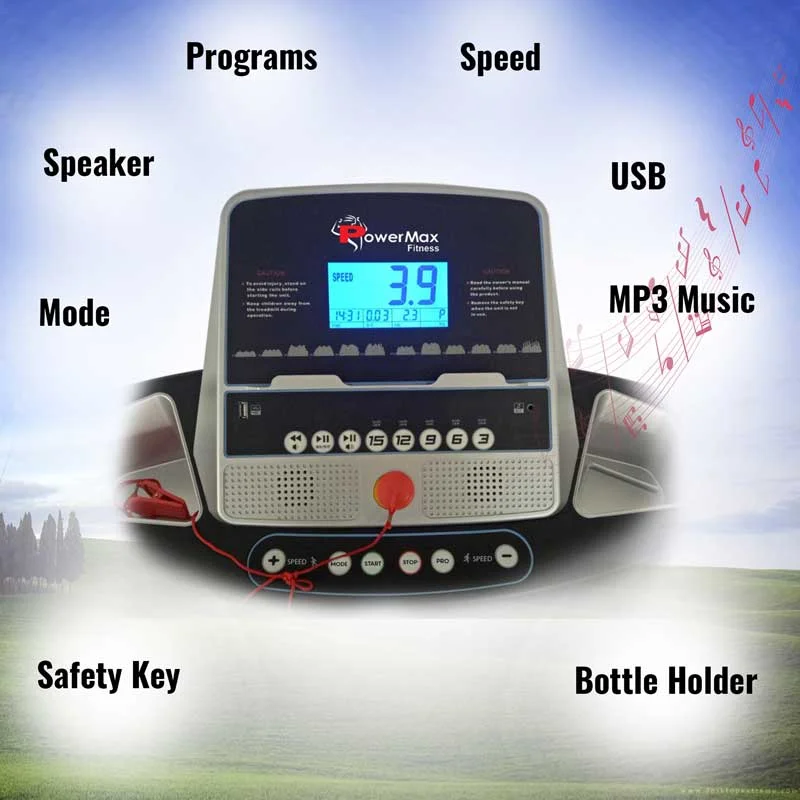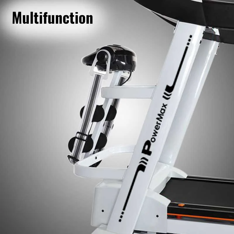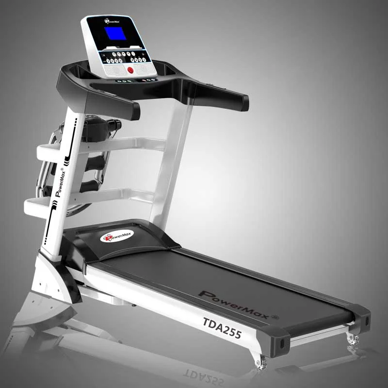 The PowerMax Fitness TDA-255 Multifunction Motorized Treadmill with Auto Incline distributes low-cost treadmills and other home fitness equipment. The 3 User define programs and 12 different console programs ensure you are able to vary your workout each and every time you step on to the large 50†x 17.7†running deck. Coupled with the 15 levels of auto incline and the top speed of 15.8km/h powered by a 2.0HP DC motor, you can challenge yourself on a number of ways to really boost your cardiovascular performance. The TDA-255 treadmill has a built in auto-stop function. When running you can simply attach the safety clip to your clothes and run as normal, it will auto stop if you fall or drift back dangerously on the treadmill. The auto stop function minimizes the risk of injury. The treadmill has auto-incline function up to 15% and the 5’’ LCD Display shows the time, speed, distance, incline, calories and heart rate. To calculate heart rate one has to place their palm of the hand on side rail of the handle. There are various features in TDA-255 as Bottle holder, Safety key (if you lose your balance and start falling it prevent less injury by stopping treadmill automatically), Wheels for transportation, auto-lubrication, Foldable and easy to install, iPad holder, AUX ,USB input and Music Control keys.
