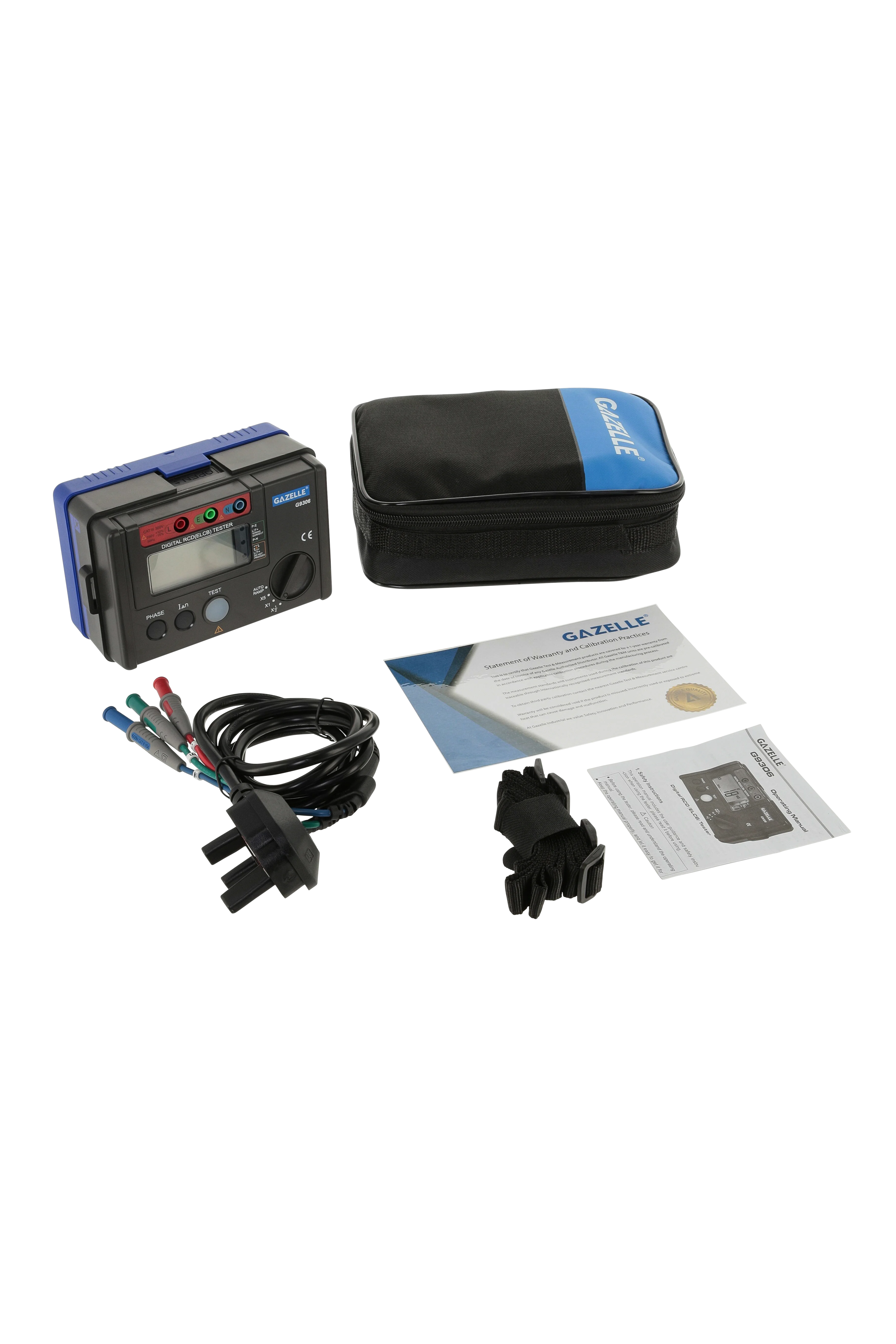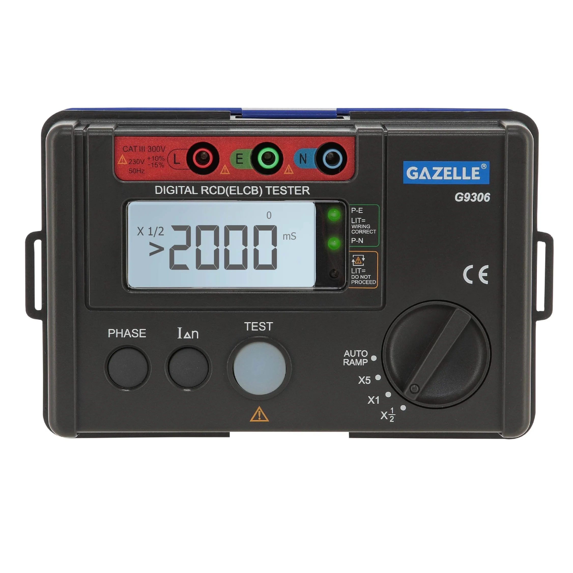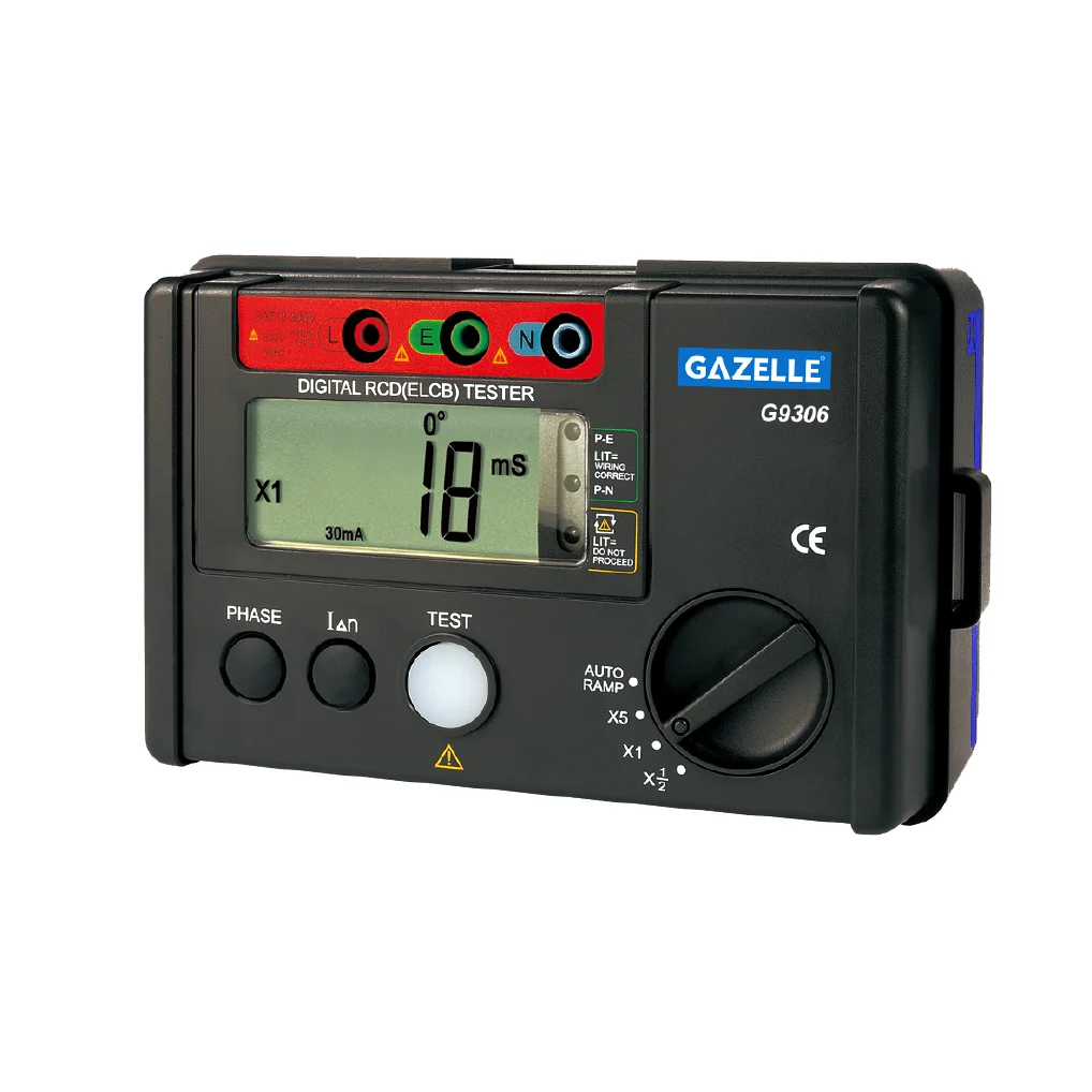 Standard Accessories: Operating Manual, Test Lead, Carrying Case 1000-count digital RCD (ELCB) tester with phase switch Connections check, disconnect buzzer AUTO RAMP, Over-range display IEC61557 standard