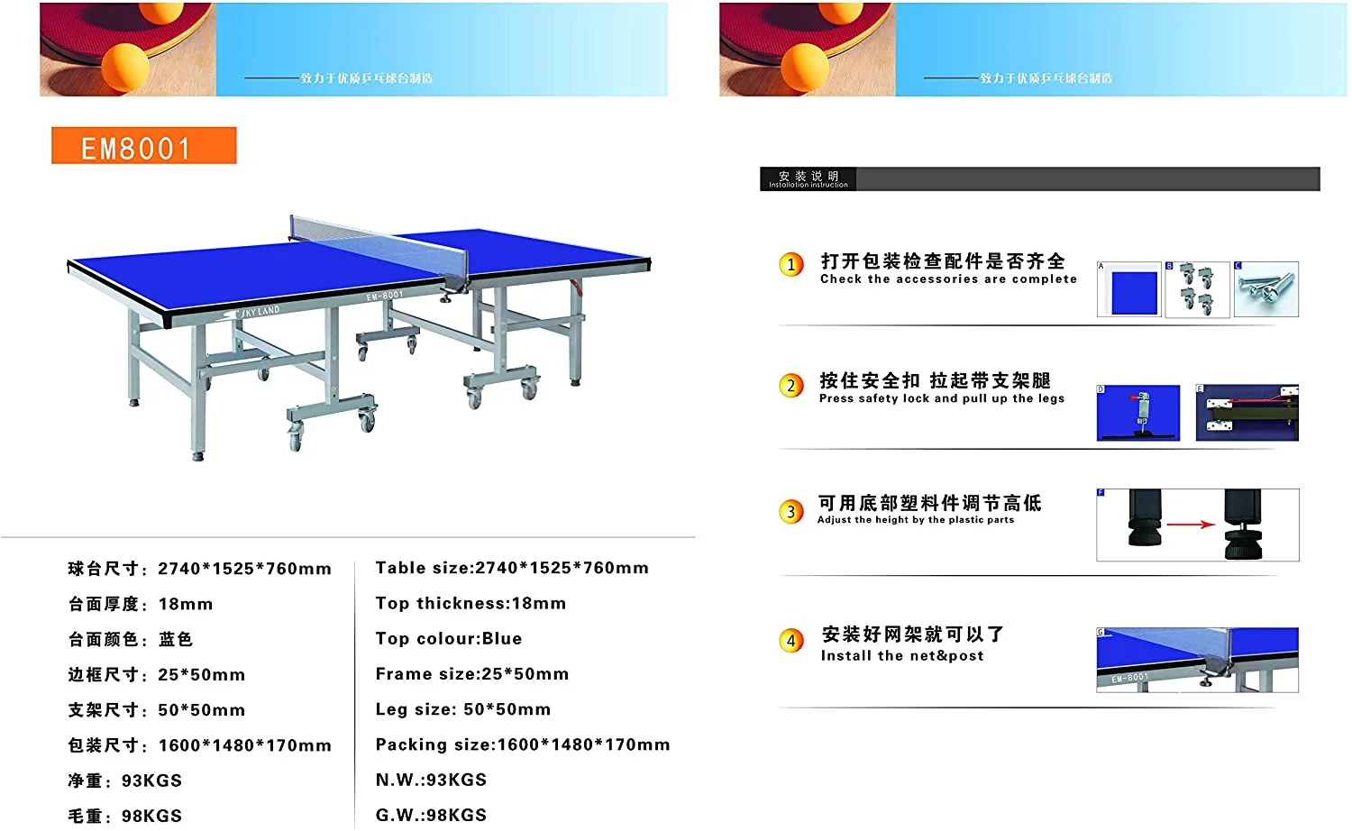 ideal game for the entire family. Easily folds up for transportation and storage Comes with oversized casters for easy mobility. Enjoy hours of fun with your friends and family. Table Size:2740*1525*760mm Brand SKY LAND Manufacturer SkyLand Item model number EM-8001 Product Dimensions 15 x 160 x 147 cm; 98.01 Kilograms This high-quality, official sized table tennis table is an ideal game for the entire family. Easily folds up for transportation and storage with oversized casters for easy mobility. Enjoy hours of fun with your friends and family. Product Features: Brand : Skyland Type : Tennis Euipment Table Size:2740*1525*760mm Top tickness:18mm Frame Size: 25*50mm Leg Size: 50*50mm Packing Size: 1600*1480*170mm Color : Blue/Silver Product Weight : 93 Kgs Foldable : Yes