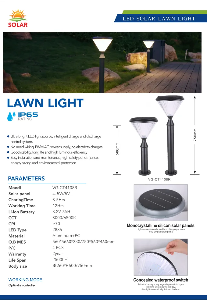 Size: ?26*20*80cm Material: Aluminum + PC Color: 3000/6500K RA > 70 IP65 Solar battery: 5V 4.5W Battery: 3.2V 7AH Charging time: 3-5H Working time: 12H Operation: Light control Warranty: 2 years