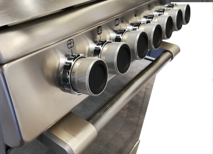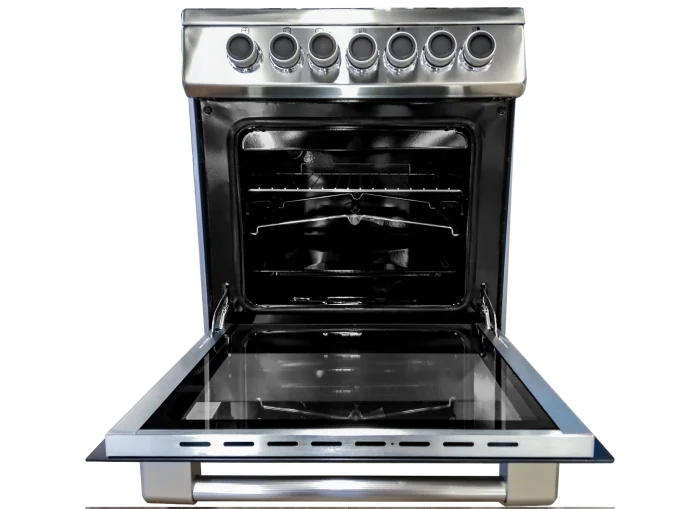 Type: Gas Color: Stainless Steel No. Of Cooktops: 4 Oven: 67L, Natural Convection Closed Door Grilling, Full safety DIM: W600 x H850 x D600 mm Cooktop: Cast Iron Grids Easy-to-clean, Removable oven-glass Features: Glass-lid, Pressed-Cooktop, 60-minute minder, Chrome Knobs Accessories: 1x Wire-shelves, 1x Enamel Tray, 1x Rotisserie Spit
