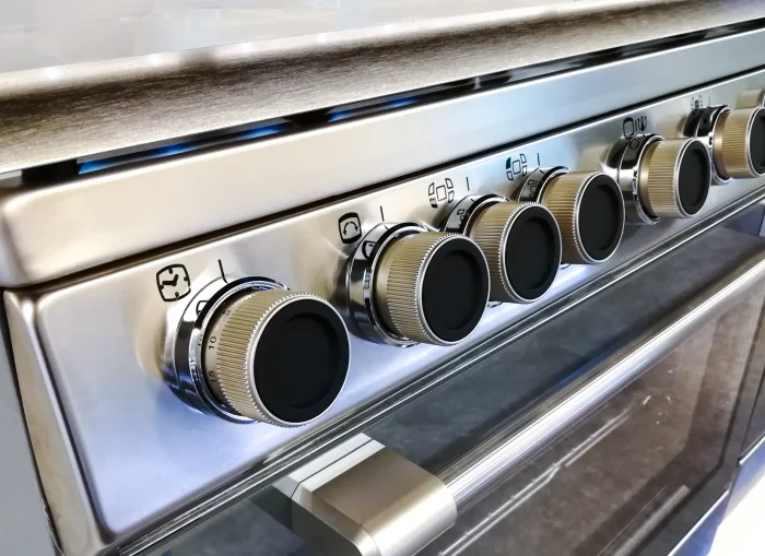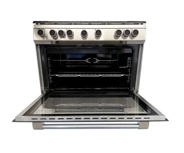 Type: Gas Color: Stainless Steel No. Of Cooktops: 5 Oven: 133L, Natural Convection Closed Door Grilling, Full safety DIM: W900 x H850 x D600 mm Cooktop: Cast Iron Grids Easy-to-clean, Removable oven-glass Features: Glass-lid, Pressed-Cooktop, Digital Timer, Chrome Knobs , Chrome Side-racks, 60-minute minder Accessories: 2x Wire-shelves, 1x Enamel Tray, 1x Rotisserie Spit