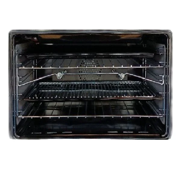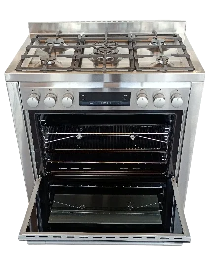 Type: Gas Color: Stainless Steel No. Of Cooktops: 5 Oven: 133L, Fan-assisted Convection Closed Door Grilling, Full safety DIM: W900 x H850 x D600 mm Cooktop: Cast Iron Grids Easy-to-clean, Removable oven-glass Features: Squared-Cooktop, Digital Timer, 60-minute minder Accessories: 3 Wire-shelves, 2 Enamel Tray, 2 Rotisserie Spit