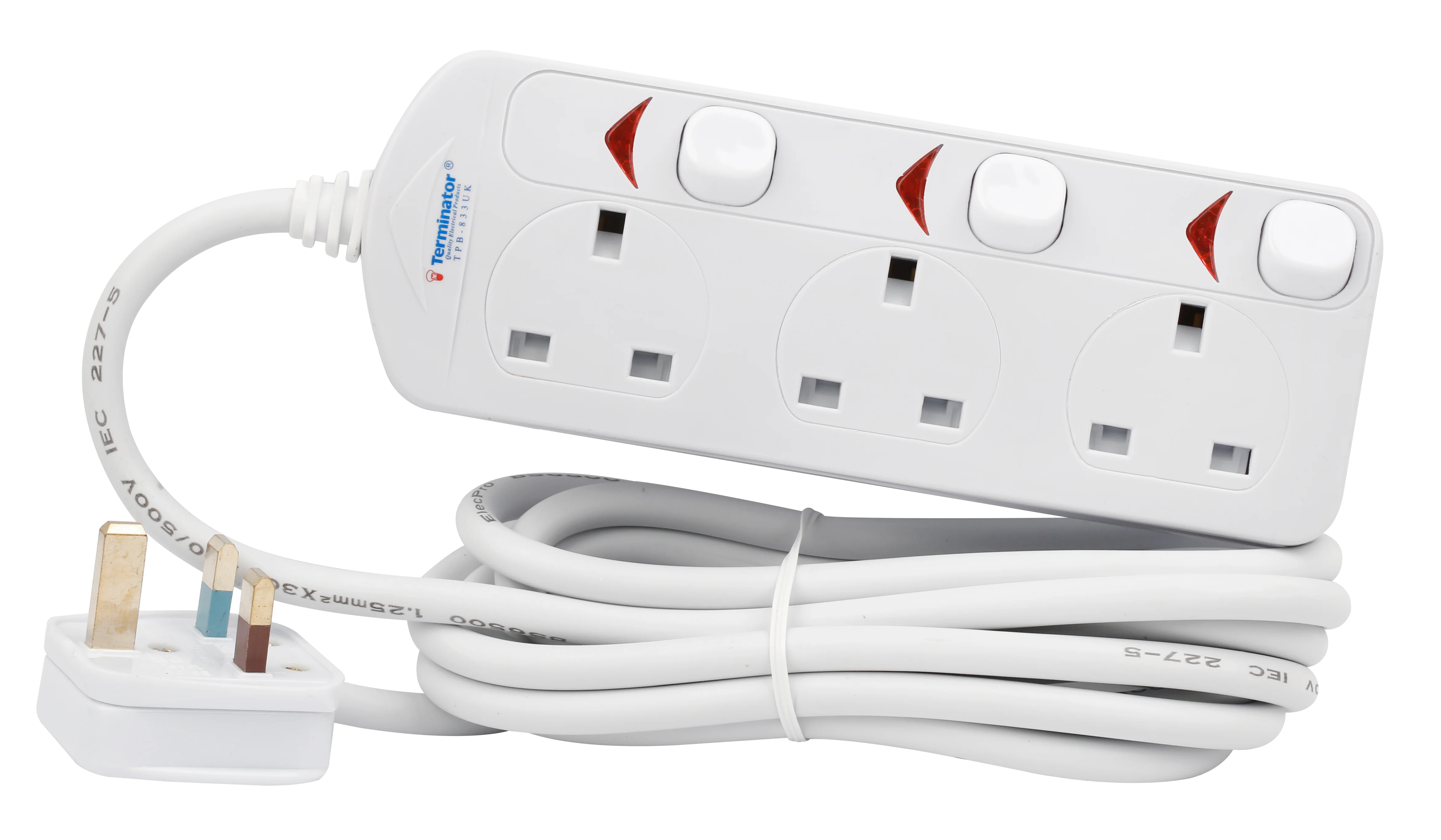 TERMINATOR 3 Way UK Power Extension Socket With Individual Switches 5M 1.25mm2 Cable 13A Plug