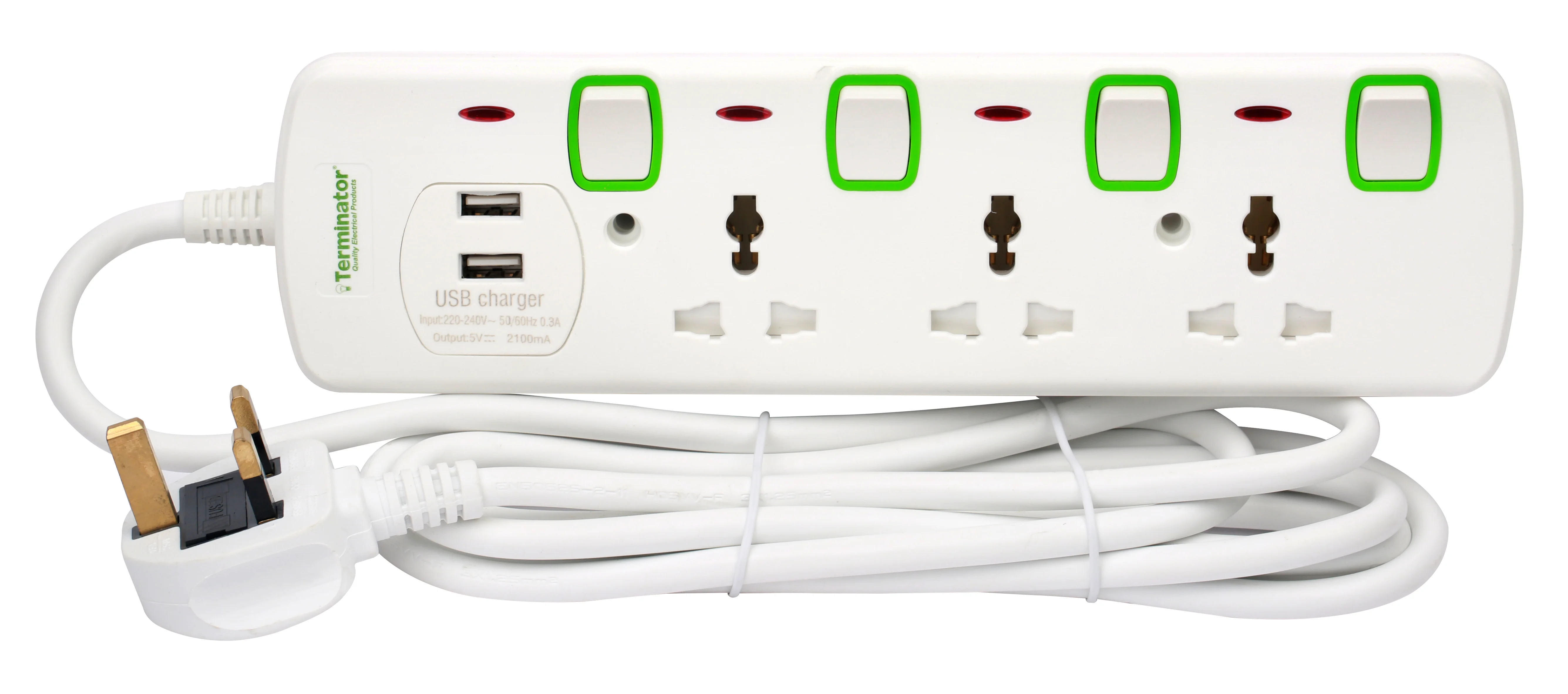 TERMINATOR 3 Way Universal Power Extension Socket With 2 USB 2.1A, 3M Cable 13A
