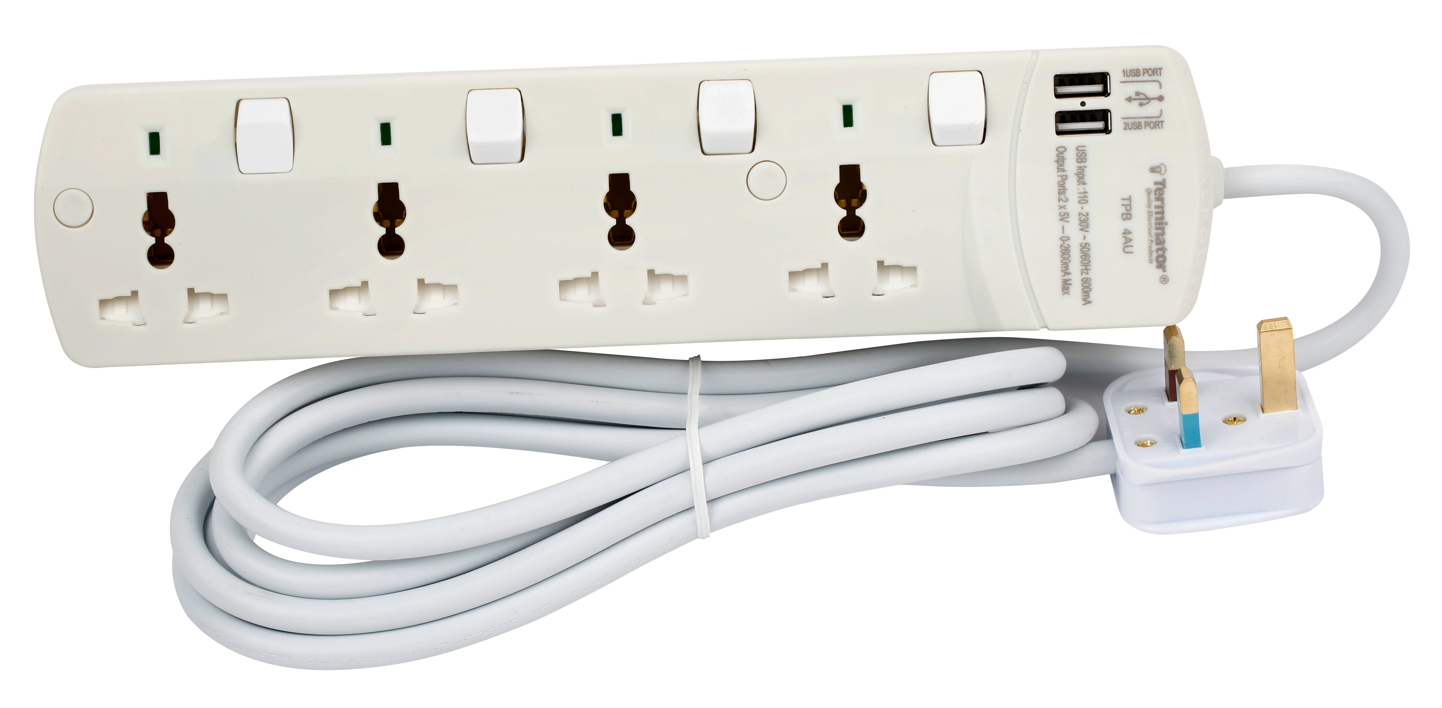 TERMINATOR 4 Way Universal Power Extension Socket With Individual Switches & Indicators 2 USB & 3M 13A