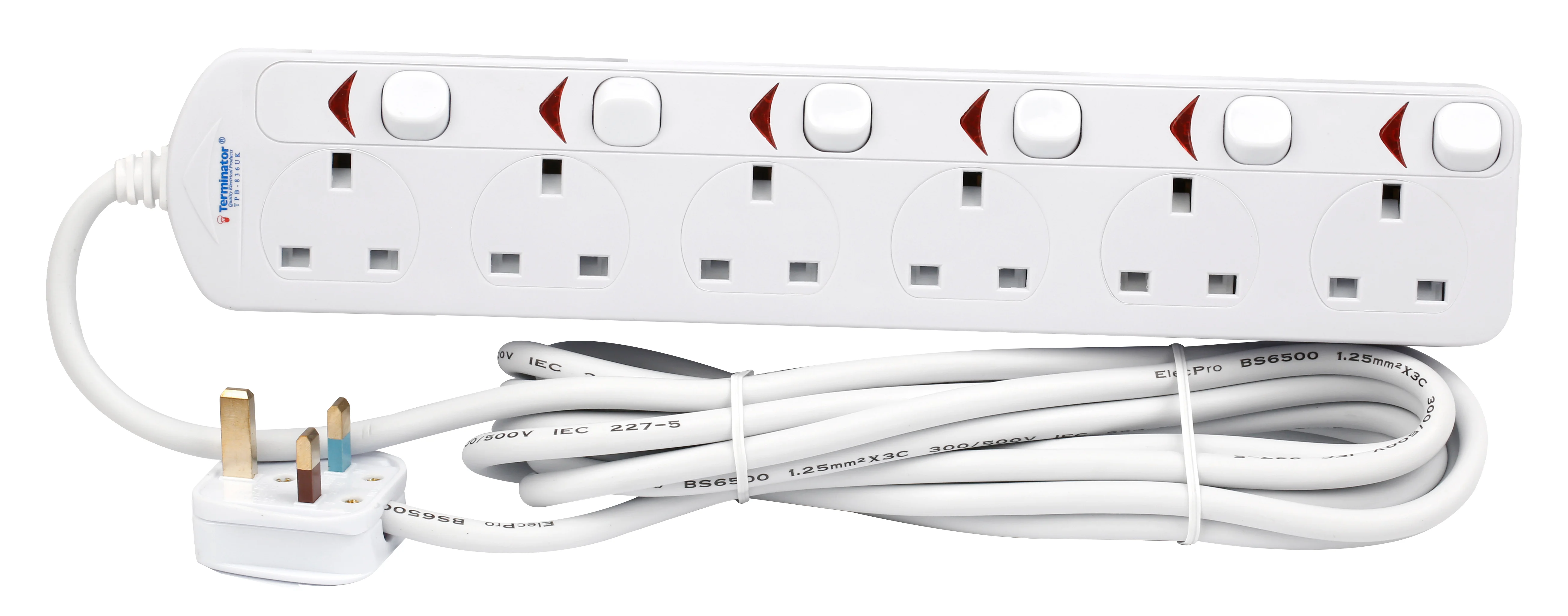 TERMINATOR 6 Way UK Power Extension Socket With Individual Switches 3M 1.25mm2 Cable 13A Plug